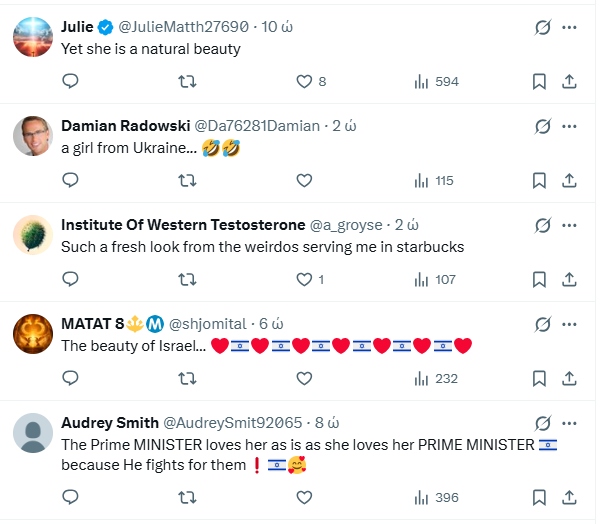 Η συζήτηση ξεκίνησε όταν χρήστες του διαδικτύου άρχισαν να εστιάζουν στη φωτογραφία της νεαρής. Στην πλατφόρμα X εμφανίστηκαν εκατοντάδες αναρτήσεις και σχόλια. «Απλώς κοιτάξτε την», έγραψε ένας χρήστης, ενώ άλλοι πρόσθεσαν: «Είναι τόσο όμορφη», «Είναι εκπληκτική», «Πρέπει να έρθω στο Τελ Αβίβ το συντομότερο δυνατό», «Είναι το νέο μου crush», «Τα πιο όμορφα κορίτσια είναι οι Εβραίες», ενώ κάποιος άλλος σχολίασε: «Εντάξει, αυτό ήταν – το Ισραήλ κέρδισε».