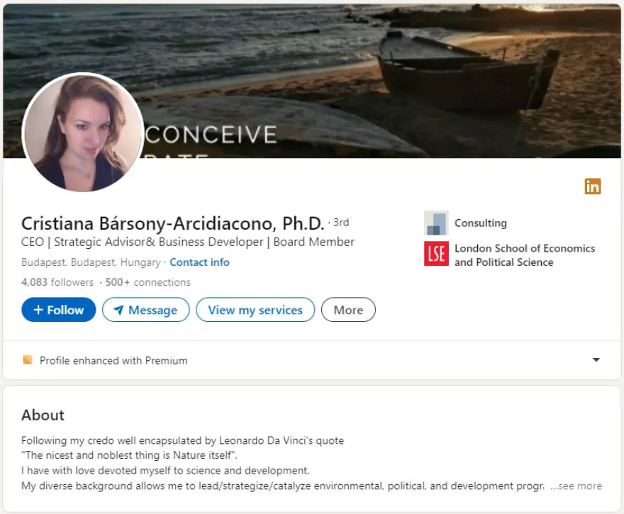 Στο προφίλ της στο LinkedIn αναφέρει ότι έχει εργαστεί για διεθνείς οργανισμούς, όπως η UNESCO. «Η εταιρία ιδρύθηκε πριν το 2010 με τη δημιουργία γραφείου στη Βουδαπέστη και από τότε έχει αυξήσει την ομάδα συμβούλων της» αναφέρει η Cristiana Barsony-Arcidiacono στο προφίλ της.