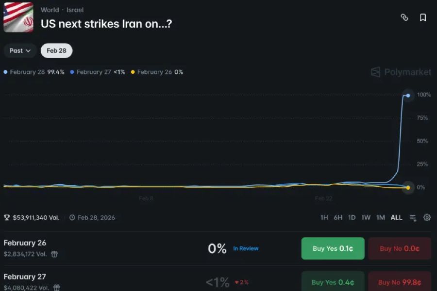 Πολλοί χρήστες στην αμερικανική πλατφόρμα στοιχημάτων και προβλέψεων Polymarket κέρδισαν σημαντικά ποσά στοιχηματίζοντας πότε θα πραγματοποιηθούν οι επιθέσεις των ΗΠΑ κατά του Ιράν. Τουλάχιστον επτά διαφορετικοί λογαριασμοί στην πλατφόρμα φαίνεται ότι κέρδισαν συνολικά πάνω από 1,5 εκατ. δολάρια στοιχηματίζοντας ότι οι ΗΠΑ θα πλήξουν το Ιράν αυτό το Σαββατοκύριακο. Πέντε από αυτούς ήταν νέοι λογαριασμοί.
