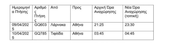 Συγκεκριμένα, όλες οι προγραμματισμένες πτήσεις στις 9 Απριλίου 2025 ακυρώνονται, εκτός από τις παρακάτω οι οποίες θα πραγματοποιηθούν με τις εξής τροποποιήσεις:
