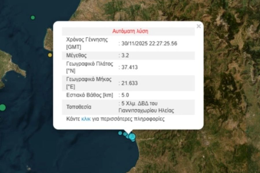 Σεισμική δόνηση μεγέθους 3,2 βαθμών της Κλίμακας Ρίχτερ σημειώθηκε λίγο μετά τα μεσάνυχτα της Κυριακής (00:27) στην Ηλεία.