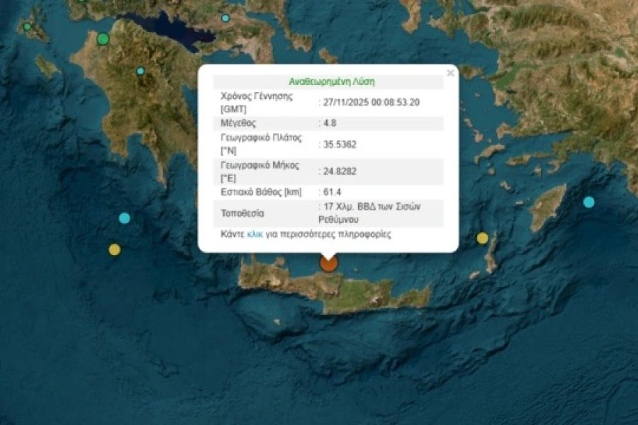 Σεισμική δόνηση μεγέθους 4,8 βαθμών της κλίμακας Ρίχτερ ταρακούνησε στις 02:08 την Κρήτη.