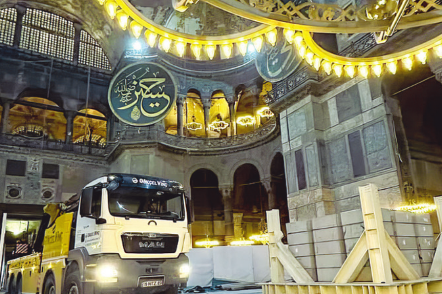 Από την πλευρά του, ο Δρ. Βασίλης Μπαρδάκης, πρόεδρος του Συλλόγου Πολιτικών Μηχανικών, τονίζει στην «R»: «Ο ναός της Αγίας του Θεού Σοφίας, το κορυφαίο μνημείο της χριστιανοσύνης, είναι το λαμπρότερο παράδειγμα του ρυθμού της τρουλαίας βασιλικής. Η εισαγωγή βαρέων οχημάτων στο εσωτερικό αντιτίθεται στις επιστημονικές αρχές συντήρησης και αυξάνει τη διακινδύνευση του μνημείου. Το 2025 υπάρχουν ποικίλοι τρόποι να μεταφέρεις ικριώματα, ενώ υπάρχουν και εξαιρετικά ελαφρά στοιχεία ικριωμάτων πολύ μεγάλης αντοχής. Οι δοκιμές αντοχής που αναφέρουν οι Τούρκοι ειδικοί είναι στιγμιαίες».
