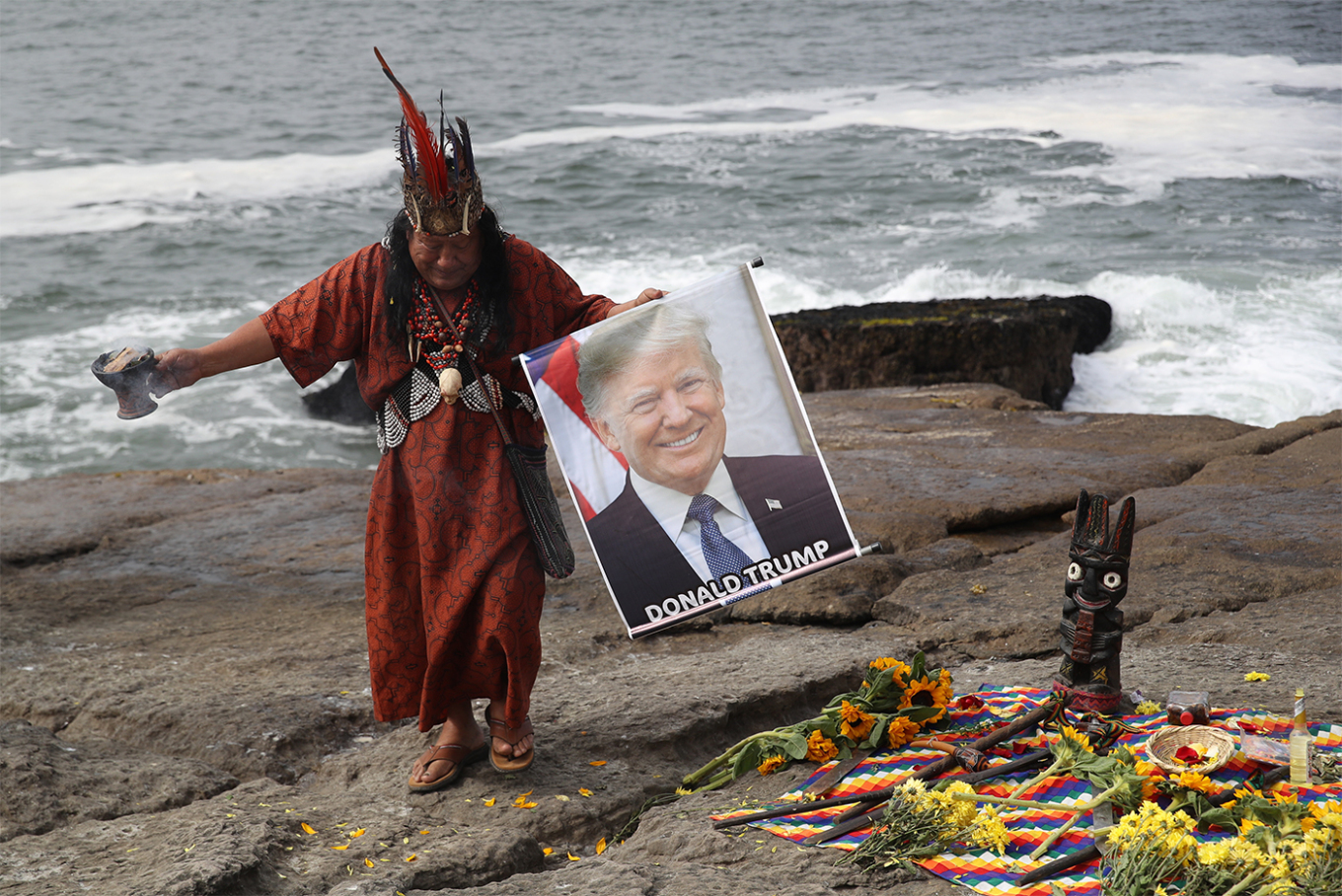 "Οι ΗΠΑ θα πρέπει να προετοιμαστούν επειδή ο Ντόναλντ Τραμπ θα αρρωστήσει σοβαρά", προέβλεψε ο Χουάν ντε Ντίος Γκαρσία καθώς βρέθηκε μαζί με άλλους σαμάνους σε παραλία της νότιας Λίμας φορώντας πολύχρωμα πόντσο και σκορπίζοντας λουλούδια στην άμμο.
