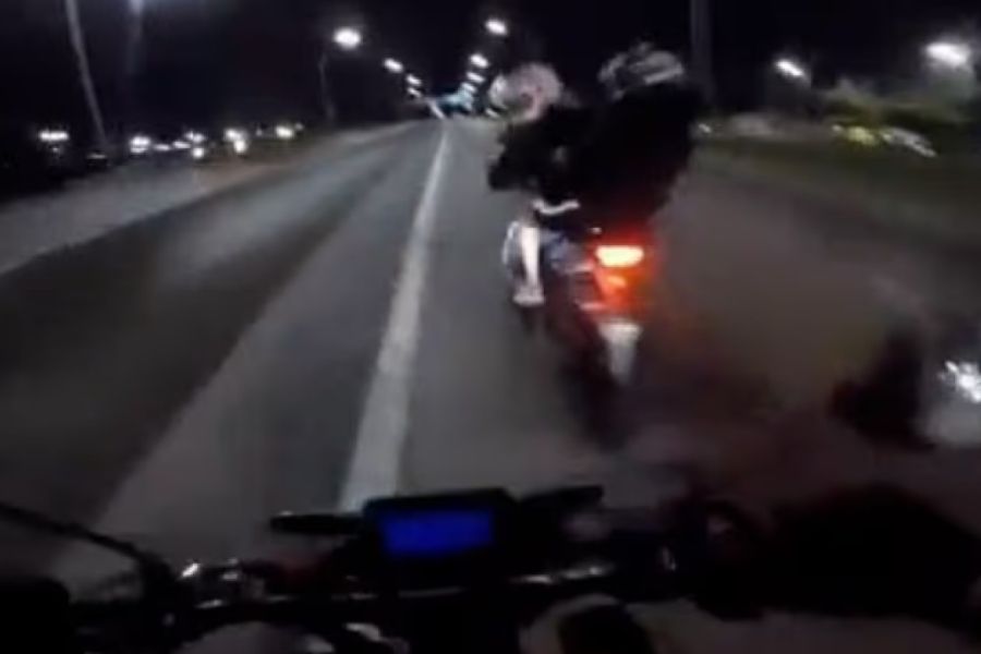 Στο βίντεο φαίνεται το θύμα της κλοπής να κινείται με μεγάλη ταχύτητα στη λωρίδα ταχείας κυκλοφορίας όταν τον πλησιάζουν δύο δράστες με μια άλλη μοτοσικλέτα.