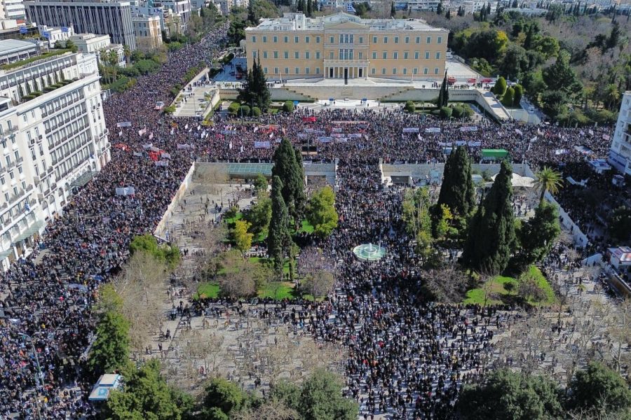 Στην Αθήνα χιλιάδες κόσμου συγκεντρώθηκαν στο Σύνταγμα όπου οι συγγενείς των θυμάτων απηύθυναν φορτισμένες ομιλίες καταγγέλλοντας την πολιτεία και την κυβέρνηση για ολιγωρία και απόπειρα συγκάλυψης των πραγματικών αιτιών που οδήγησαν στο σιδηροδρομικό δυστύχημα.