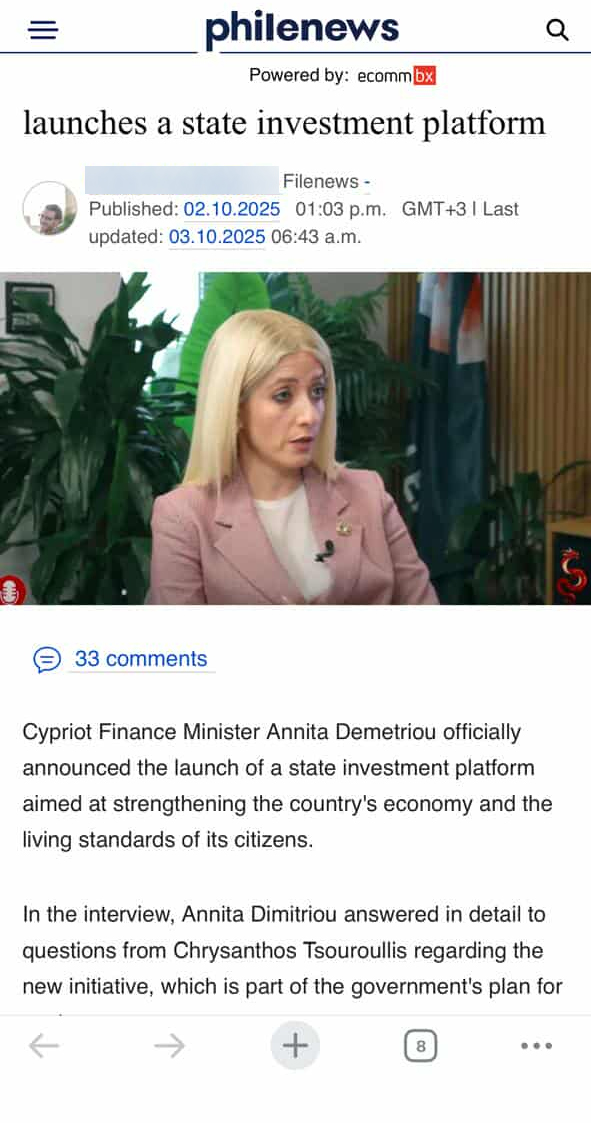 Συγκεκριμένα, όπως θα δείτε και στη φωτογραφία πιο κάτω, ένα από τα παραπλανητικά και ψευδή δημοσιεύματα παρουσιάζει την Αννίτα ως υπουργό Οικονομικών να μιλά στον «Φιλελεύθερο» και να εγκαινιάζει και καλά μια πλατφόρμα κρατικών επενδύσεων.