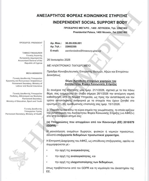 Δεν θα καταθέσει ενώπιον της Επιτροπής Θεσμών τα ονόματα των χορηγών του Φορέα Κοινωνικής Στήριξης, καθώς και τις εισφορές στις οποίες προέβησαν από το 2020 και μετά, ο Γενικός Λογιστής της Δημοκρατίας και Ταμίας του Φορέα, Ανδρέας Αντωνιάδης.