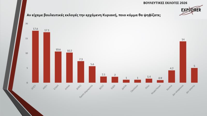 Αναλυτικά, σύμφωνα με τα αποτελέσματα της έρευνας, ο ΔΗΣΥ παραμένει στην πρώτη θέση με ποσοστό 17,6%. Στη δεύτερη θέση, με μικρή διαφορά, ακολουθεί το ΑΚΕΛ με ποσοστό 17,1%. Το ΕΛΑΜ, καταγράφει ποσοστό 10,6% και βρίσκεται στην τρίτη θέση.