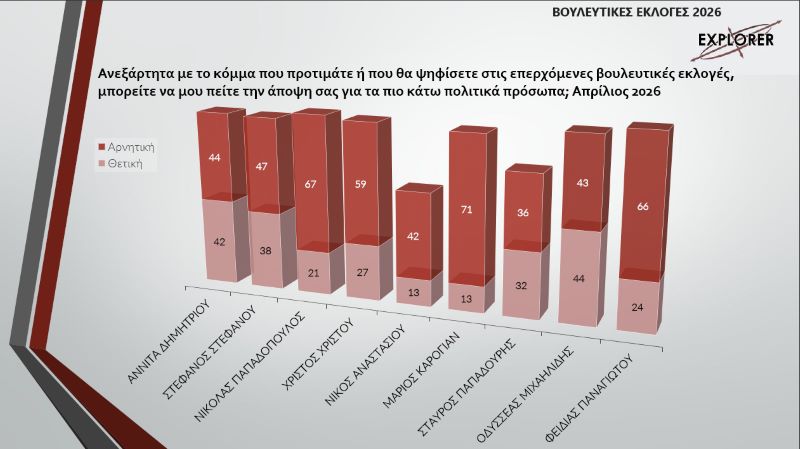 Για την πρόεδρο του ΔΗΣΥ, Αννίτα Δημητρίου οι θετικές μονάδες ήταν 42 και οι αρνητικές 44. Ο ΓΓ του ΑΚΕΛ, Στέφανος Στεφάνου έχει 38 θετικές και 47 αρνητικές. Ο πρόεδρος του ΔΗΚΟ παρουσιάζει 21 θετικές και 67 αρνητικές, ο Χρίστος Χρίστου του ΕΛΑΜ 27 έναντι 59, ο Νίκος Αναστασίου της ΕΔΕΚ 13-42, ο Μάριος Καρογιάν πρόεδρος της ΔΗΠΑ 13-71, ο Σταύρος Παπαδούρης των Οικολόγων 32-36. Ο Φειδίας Παναγιώτου με 24 έναντι 66.
