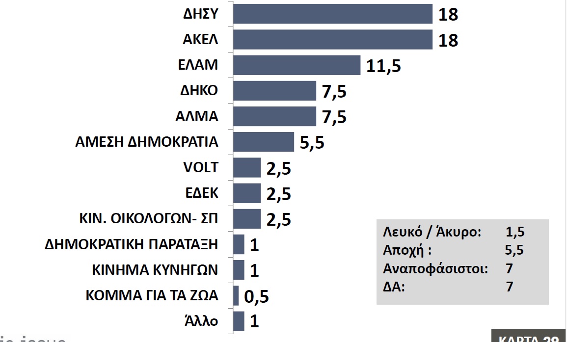 Συγκεκριμένα, ΔΗΣΥ και ΑΚΕΛ μοιράζονται την πρώτη θέση με 18%...