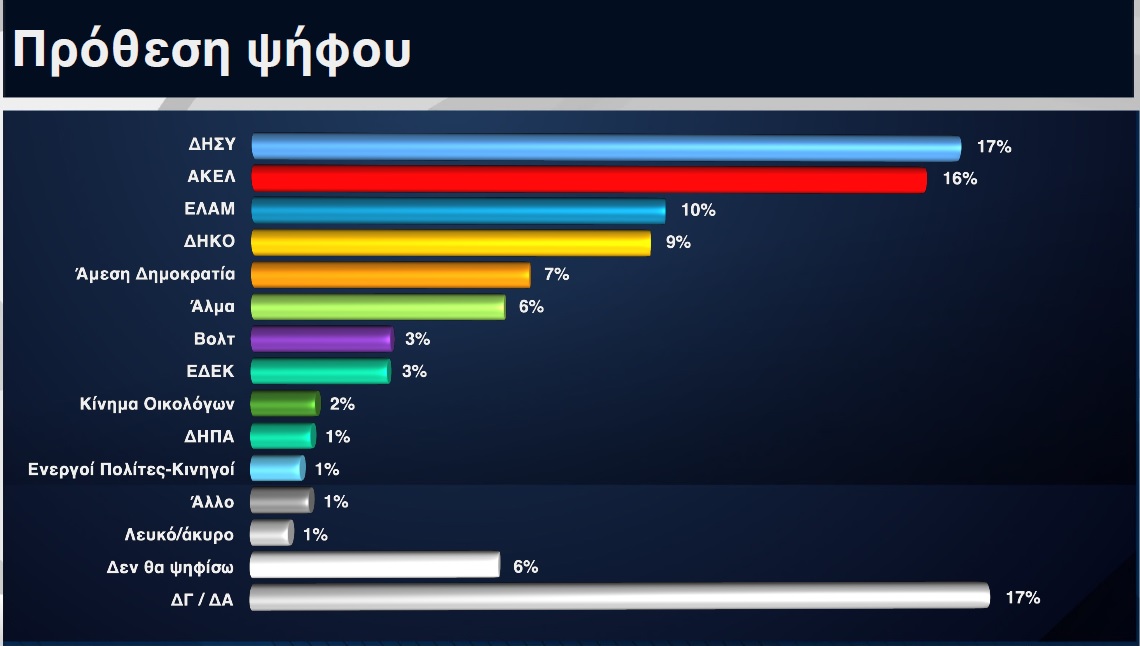 Την ίδια στιγμή, το ΔΗΚΟ φαίνεται να πλησιάζει στη μία ποσοστιαία μονάδα το τρίτο ΕΛΑΜ, ενώ η ΑΜΕΣΗ ΔΗΜΟΚΡΑΤΙΑ και το ΑΛΜΑ φαίνεται να μην έχουν τη δυναμική που εμφάνιζαν σε άλλες δημοσκοπήσεις και βρίσκονται στην πέμπτη και έκτη θέση αντίστοιχα με πολύ μικρή διαφορά.