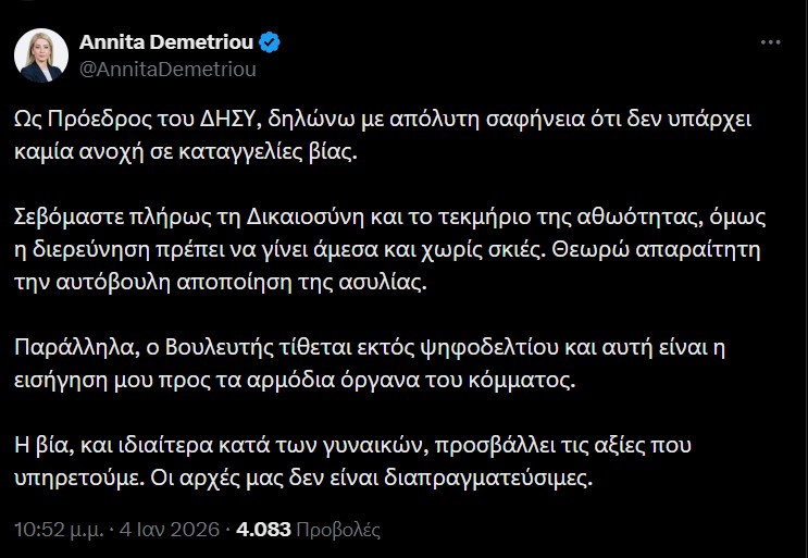 Υπενθυμίζεται πως με ανάρτηση της στο Χ, η Πρόεδρος του κόμματος Αννίτα Δημητρίου γνωστοποίησε ότι o συγκεκριμένος βουλευτής είναι εκτός ψηφοδελτίου, ενώ τον κάλεσε να αποποιηθεί την βουλευτική του ασυλία, μετά από καταγγελία εις βάρος του από τη σύντροφό του για ξυλοδαρμό.