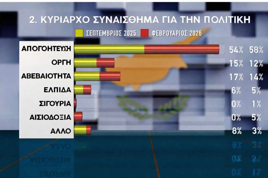 Η απογοήτευση είναι μακράν το κυρίαρχο συναίσθημα των πολιτών για την πολιτική, με το ποσοστό της να ανέρχεται στο 58%, σύμφωνα με τη δημοσκόπηση που διενεργήθηκε από την εταιρεία Prime Consulting, για λογαριασμό της τηλεόρασης Sigma, τα αποτελέσματα της οποίας προβλήθηκαν (16/2) στην εκπομπή «Χωρίς Περιστροφές».