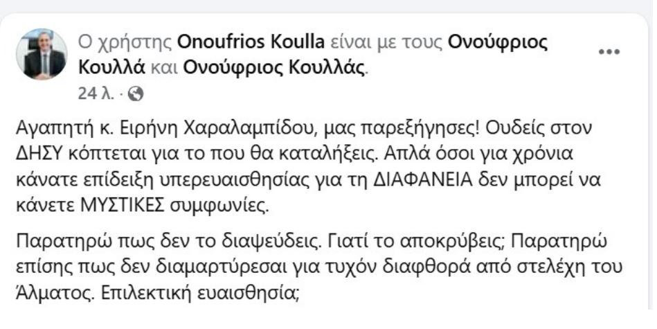 Σε ανάρτηση του στο facebook o κ. Κουλλά τόνισε πως «αγαπητή κ. Ειρήνη Χαραλαμπίδου, μας παρεξήγησες! Ουδείς στον ΔΗΣΥ κόπτεται για το που θα καταλήξεις. Απλά όσοι για χρόνια κάνατε επίδειξη υπερευαισθησίας για τη ΔΙΑΦΑΝΕΙΑ δεν μπορεί να κάνετε ΜΥΣΤΙΚΕΣ συμφωνίες», προσθέτοντας ότι «παρατηρώ πως δεν το διαψεύδεις. Γιατί το αποκρύβεις; Παρατηρώ επίσης πως δεν διαμαρτύρεσαι για τυχόν διαφθορά από στελέχη του Άλματος. Επιλεκτική ευαισθησία;».
