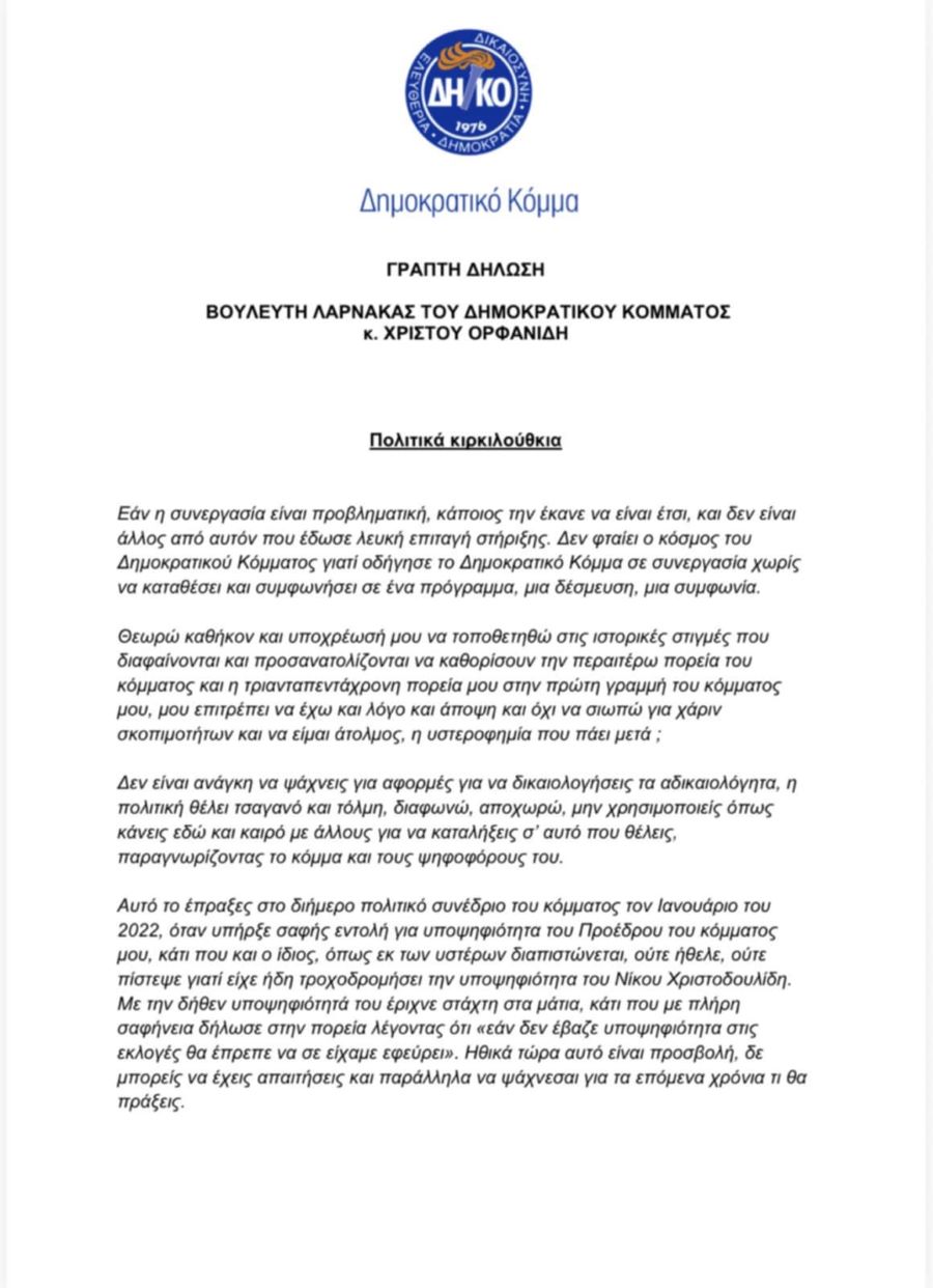 Ξεκάθαρες αιχμές κατά του Προέδρου του ΔΗΚΟ φαίνεται να αφήνει ο Βουλευτής του ΔΗΚΟ Χρίστος Ορφανίδης, ο οποίος με ανακοίνωση του καυτηριάζει τη στάση του Νικόλα Παπαδόπουλου ως συγκυβερνών κόμμα.