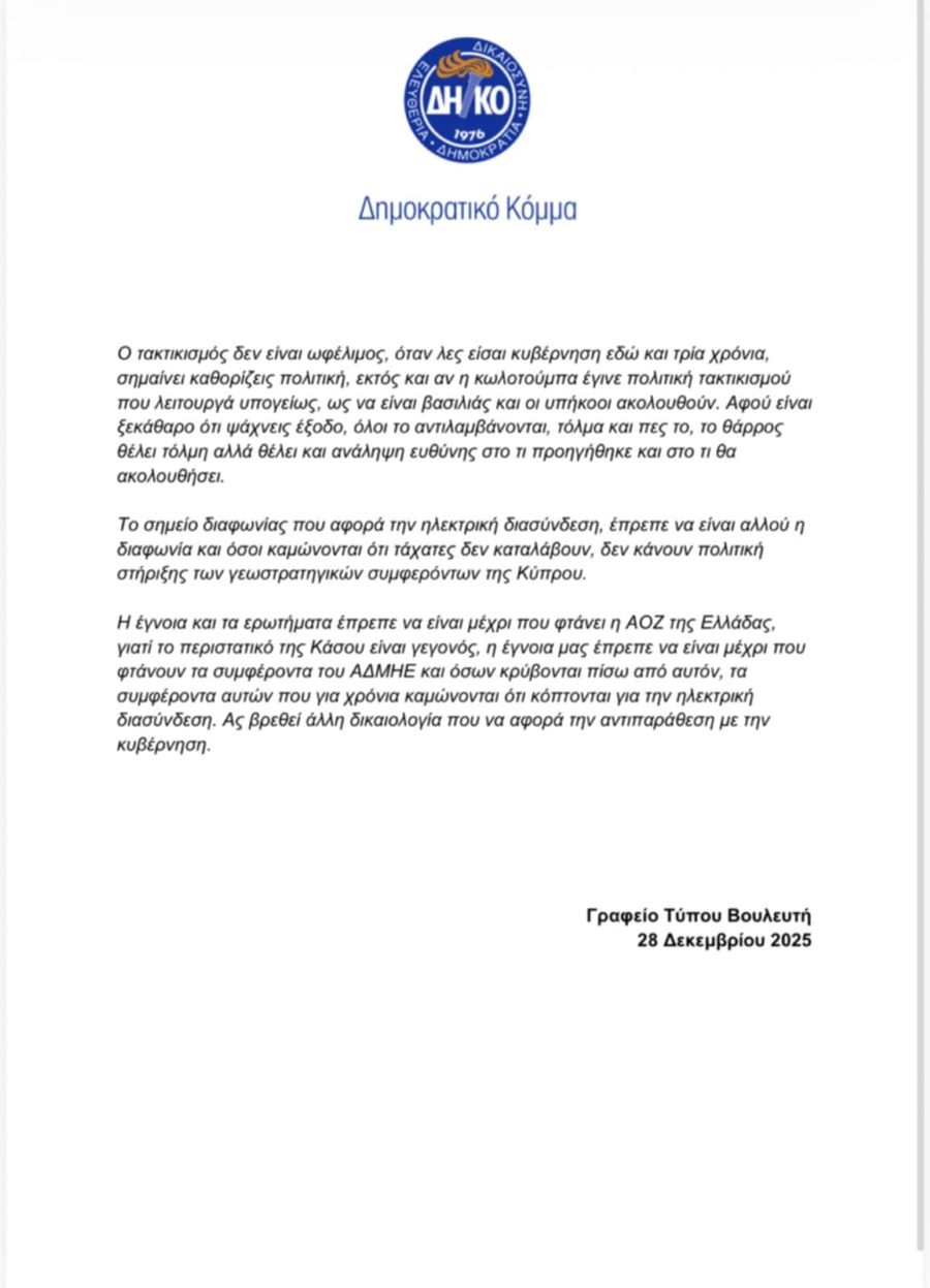 Όπως έγραψε ο Βουλευτής του ΔΗΚΟ αναφερόμενος στην ηλεκτρική διασύνδεση Κύπρου- Ελλάδας: "Ας βρεθεί άλλη δικαιολογία που να αφορά την αντιπαράθεση με την κυβέρνηση".