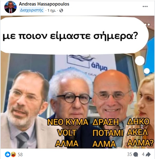 Νέα «πυρά» από τον Ανδρέα Χασαπόπουλο κατά του Οδυσσέα Μιχαηλίδη και όχι μόνο. Σε νέα του ανάρτηση στα social media, τρολάρει τον επικεφαλής του νεοσύστατου κόμματος ΑΛΜΑ, καθώς επίσης τους Κωνσταντίνο Χριστοφίδη, Χαρίδημο Τσούκα και Ειρήνη Χαραλαμπίδου.
