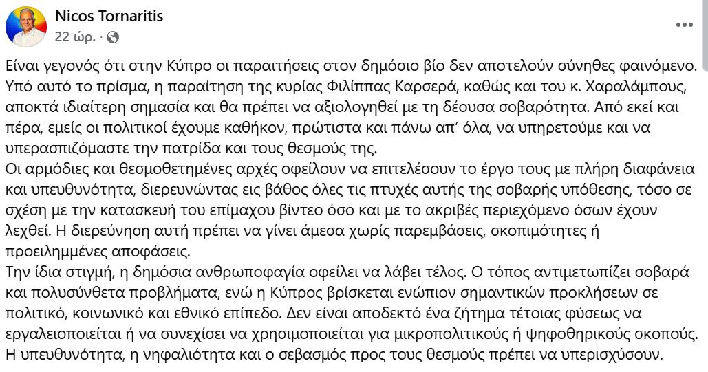 • Από εκεί και πέρα ΕΚΘΕΙΑΖΕΙ έμμεσα αλλά σαφέστατα την ΦΙΛΙΠΠΑ ΚΑΡΣΕΡΑ- ΧΡΙΣΤΟΔΟΥΛΙΔΗ και τον ΧΑΡΑΛΑΜΠΟ ΧΑΡΑΛΑΜΠΟΥΣ, υποδεικνύοντας ότι «οι παραιτήσεις στο δημόσιο βίο δεν αποτελούν σύνηθες φαινόμενο και η πράξη των δυο αποκτά ιδιαίτερη σημασία». Ε, βέβαια όλοι αυτοί που φωνασκούν κατά τον Τορναρίτη ΟΔΗΓΗΣΑΝ τα κόμματα τους στο βάραθρο και στην ανυποληψία χωρίς να αναλαμβάνουν ΟΥΔΕΠΟΤΕ ΕΥΘΥΝΕΣ και να παραιτούνται, παρά μόνο ζητούν ΜΑΝΙΩΔΩΣ από όλους τους άλλους. Εξάλλου, πέραν του αείμνηστου ΚΥΠΡΟΥ ΧΡΥΣΤΟΣΤΟΜΙΔΗ, που παραιτήθηκε από Υπ. Δικαιοσύνης, δεν παρατηρήθηκε και κάποια άλλη εθελούσια φυγή από πολιτειακό- κομματικό αξίωμα, λόγω ΕΥΘΙΞΙΑΣ ή ευαίσθητων αντανακλαστικών.