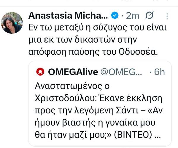 - Απίστευτο αλλά Κυπριστανικό: Τι θέλει να πει η λογοτέχνης και εμπροσθοφυλακή του στρατού ΟΔΥΣΣΕΑ ΜΙΧΑΗΛΙΔΗ, η αδελφή του ΑΝΑΣΤΑΣΙΑ Μ., σε σχετική της ανάρτηση; Η ανώτερη λειτουργός του Υπουργείου Εσωτερικών ( καλημέρα Γ.Δ ΕΛΙΚΚΟ ΗΛΙΑ, ούτε που σε λαμβάνει υπόψη, παρά τις παρατηρήσεις ότι παραβαίνει τους κανονισμούς ) αναφέρει : « Εν τω μεταξύ η σύζυγος του ( δικαστή ΜΙΧΑΛΑΚΗ ΧΡΙΣΤΟΔΟΥΛΟΥ που κατηγορείται από τον ΜακΔρους μέσω της Σάντης) είναι μια εκ των 8 δικαστών ( αχ αυτό το 8-0 καίει τους Μιχαηλίδηδες) στην απόφαση παύσης του Οδυσσέα». Όπερ εστίν μεθερμηνευόμενο ΕΠΙΧΑΙΡΕΙ το Τασουλλούι, για την περιπέτεια της οικογένειας Χριστοδούλου και νοιώθει ψήγματα ΡΕΒΑΝΣΙΣΜΟΥ!!! Γνωρίζει κάτι περαιτέρω και θέλει να το μεταφέρει προς τους ΟΔΥΣΣΕΙΣ; Προσπαθεί να πείσει ότι πέραν από την εν λόγω δικαστή και οι άλλοι 7 του Ανωτάτου δικαστηρίου κάτι κρύβουν; Πέστε δυνατά κ. Αναστασία μας και μην αφήνετε υπονοούμενα.