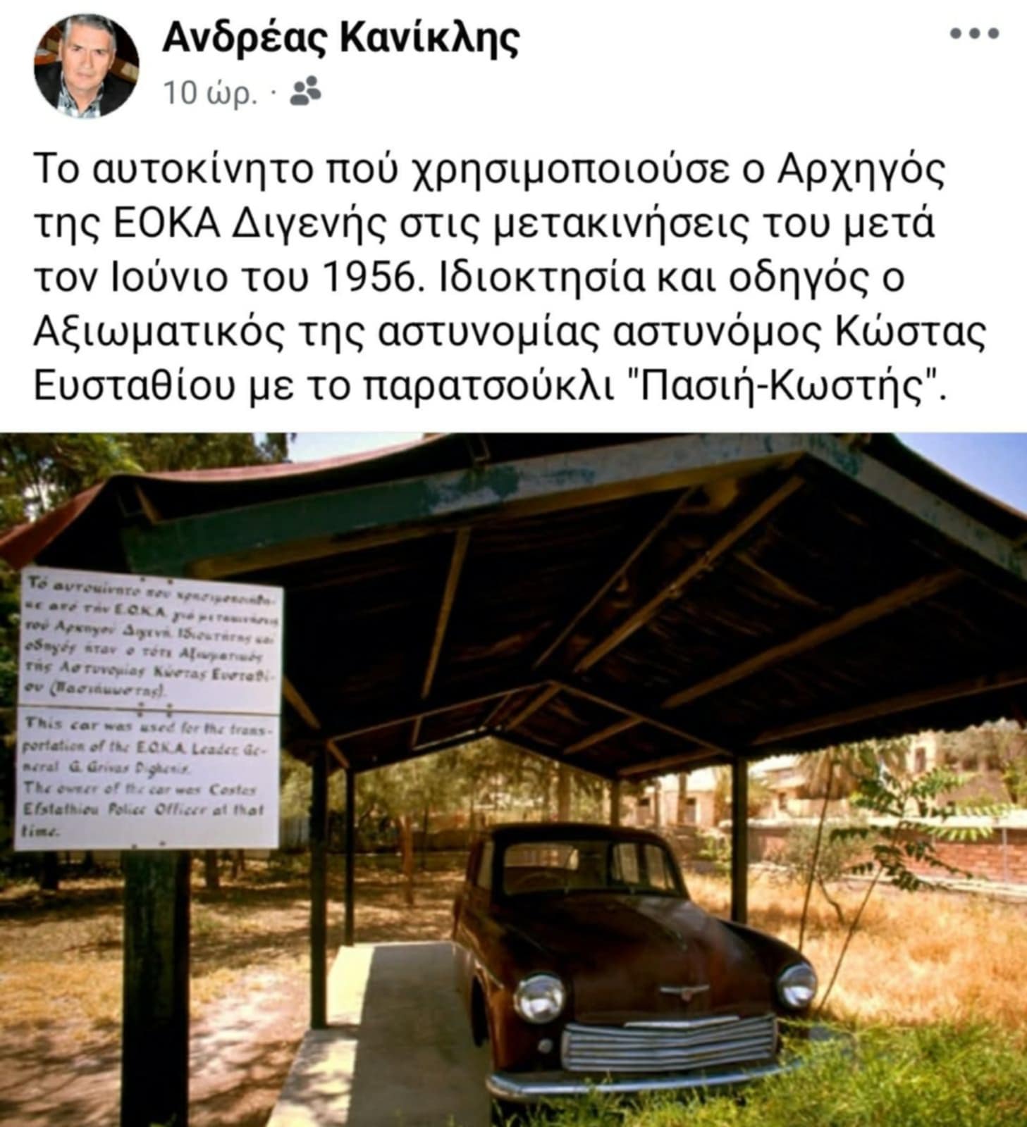 • Παρεμπιπτόντως η αρχαιολογική σκαπάνη της ΞΥΠ μέσω του ανυπέρβλητου ΑΝΤΡΕΑ ΚΑΝΙΚΛΗ σας παρουσιάζει μια άγνωστη πτυχή της ιστορίας που αφορά τον Κωστή Ευσταθίου. Ο παππούς του ανυπέρβλητος – σκληροτράχηλος αξιωματικός αστυνομίας (καμία σύγκριση με ορισμένους εκ των σημερινών φλώρων) αστυνόμος ΚΩΣΤΑΣ ΕΥΣΤΑΘΙΟΥ με το προσωνύμιο πασιηΚωστής ήταν ο προσωπικός σωματοφύλακας και οδηγός στις μετακινήσεις με το δικό του αυτοκίνητο του Αρχηγού της ΕΟΚΑ Στρατηγού Γεώργιου Γρίβα- Διγενή. Έτσι προς υπενθύμιση και γνώση…