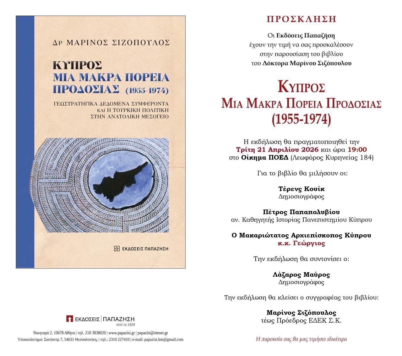 - Εκδήλωση για το βιβλίο του «Κύπρος μια μακρά πορεία προδοσίας( 1955- 1974) διοργανώνει και ο ΜΑΡΙΝΟΣ ΣΙΖΟΠΟΥΛΟΣ, όπου θα είναι ομιλητές τιτάνες, όπως Ο ΛΑΖΑΡΟΣ ΜΑΥΡΟΣ, ο ΠΕΤΡΟΣ ΠΑΠΑΠΟΛΥΒΙΟΥ, ΤΕΡΕΝΣ ΚΟΥΙΚ και ο ΑΡΧΙΕΠΙΣΚΟΠΟΣ ΓΕΩΡΓΙΟΣ, μετά τον εσπερινό αφού την επομένη άγει τα ονομαστήρια του. Στο ΚΥΚΝΕΙΟ ΑΣΜΑ Σιζόπουλου ως βουλευτής προφανώς θα παραστούν και υποψήφιοι βουλευτές της ΕΔΕΚ για να πάρουν την ευλογία του…