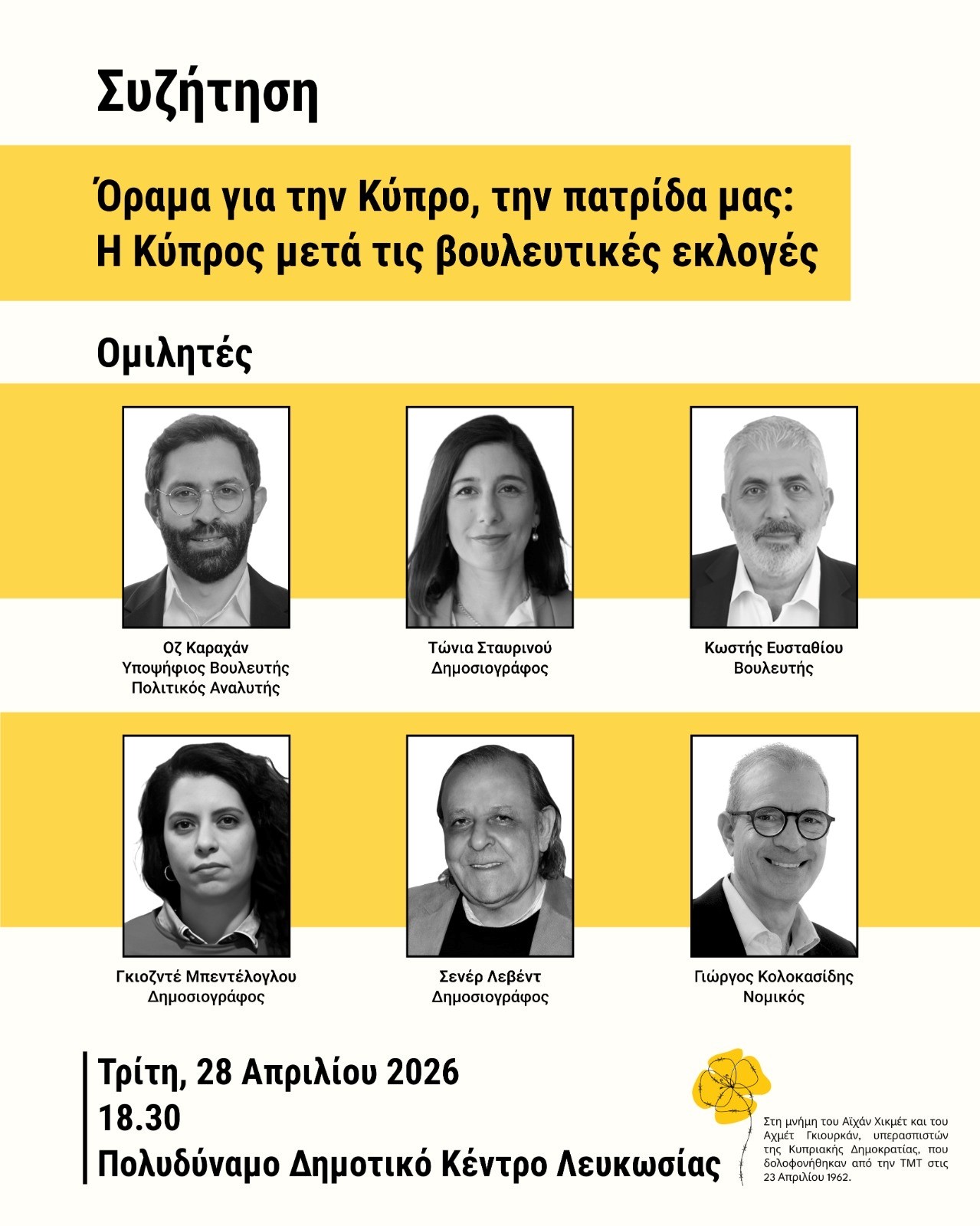 - Kάτι από επόμενη μέρα εκλογών και διαμόρφωση νέων πολιτικών μαζώξεων και συναθροίσεων πολιτικοποιημένων ανθρώπων που έχουν έγνοιες και ανησυχίες για την πατρίδα και κυρίως προς τα πού οδηγείται το ΕΘΝΙΚΟ ΘΕΜΑ και κυρίως της δημιουργίας ΑΣΠΙΔΑΣ ΠΡΟΣΤΑΣΙΑΣ της Κυπριακής Δημοκρατίας, πραγματοποιείται απόψε στις 6.30 μ.μ στο Πολυδύναμο δημοτικό κέντρο στη Λευκωσία. Εξάλλου ο τίτλος της εκδήλωσης είναι χαρακτηριστικός: «Όραμα για την Κύπρο, την πατρίδα μας: Η Κύπρος μετά τις βουλευτικές εκλογές.». Ομιλητές 3 Τ/Κ η ΟΖ ΚΑΡΑΧΑΝ- υποψήφιος βουλευτής Οικολόγων- ΣΕΝΕΡ ΛΕΒΕΝΤ- δημοσιογράφος και η ΓΚΙΟΖΝΤΕ ΜΠΕΝΤΕΛΟΓΛΟΥ δημοσιογράφος. Ε/Κ θα είναι ο απερχόμενος βουλευτής ΚΩΣΤΗΣ ΕΥΣΤΑΘΙΟΥ, ο νομικός ΓΙΩΡΓΟΣ ΚΟΛΟΚΑΣΙΔΗΣ και η δημοσιογράφος ΤΩΝΙΑ ΣΤΑΥΡΙΝΟΥ…