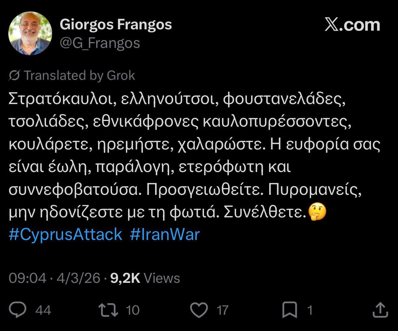 - Α κι έχουμε να σας προτείνουμε υποψήφιο για Προεδρία της Δημοκρατίας ή έστω για ΥΦΥΠΟΥΡΓΟ ΠΟΛΙΤΙΣΜΟΥ, αφού πλειστάκις πουλάει κουλτούρα καφενείου. Τον ΥΒΡΙΣΤΗ – ΑΝΘΕΛΛΗΝΑ Πρόεδρο της ΈΝΩΣΗΣ ΣΥΝΤΑΚΤΩΝ ( ΕΣΚ) ΓΙΩΡΓΟ ΦΡΑΓΚΟ, ο οποίος σε ΕΜΕΤΙΚΟ του παραλήρημα και εξεμώντας ΜΙΣΟΣ και ΧΟΛΗ, έγραψε στην πλατφόρμα Χ εμετικές ατάκες όπως: « Στρατόκαυλοι, ελληνούτσοι, φοστανελάδες, καυλοπυρέσσοντες». Με ΑΓΟΡΑΙΑ ΓΛΩΣΣΑ, την οποία δεν χρησιμοποιούν ούτε οι πρόεδροι ΧΑΜΑΙΤΥΠΕΙΩΝ, καταφέρεται κατά όλων των Ελλήνων της Κύπρου, οι οποίοι ένοιωσαν περηφάνια και κυρίως ΑΣΦΑΛΕΙΑ, για την κάθοδο των ελληνικών αεροπλάνων και φρεγατών στο νησί.