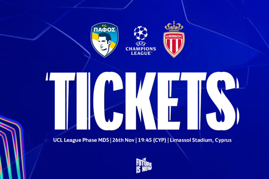H ΠΑΦΟΣ FC ανακοινώνει την έναρξη της προπώλησης των μεμονωμένων εισιτηρίων για τον 5ο αγώνα του League Phase του UEFA Champions League με αντίπαλο την AS Monaco, ο οποίος θα πραγματοποιηθεί στο Στάδιο ‘’Alphamega’’ στη Λεμεσό, την Τετάρτη 26/11/2025 και ώρα 19:45.