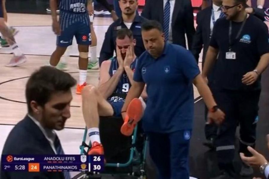 Ο διεθνής σέντερ έδειχνε να πονάει πολύ και δεν μπορούσε να σηκωθεί, ενώ στη συνέχεια αποχώρησε από το παρκέ με καροτσάκι και με το γόνατό του δεμένο, χωρίς να μπορεί να συγκρατήσει τα δάκρυά του.