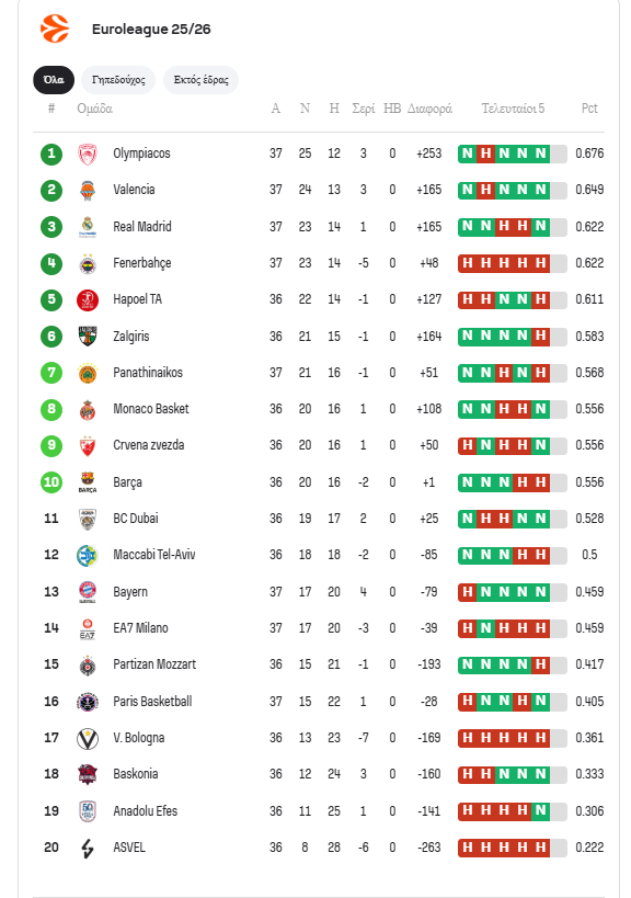 Από την άλλη, για τον Παναθηναϊκό τα πράγματα είναι πιο περίπλοκα. Οι «πράσινοι» σίγουρα δεν θα έχουν το πλεονέκτημα έδρας, ενώ μετά την ήττα από τη Βαλένθια, η απευθείας θέση στα playoffs δεν εξαρτάται από τους ίδιους. Το πιθανότερο σενάριο, πλέον, είναι να διεκδικήσουν την είσοδο στην οκτάδα μέσω της ψυχοφθόρου διαδικασίας των play-ins.