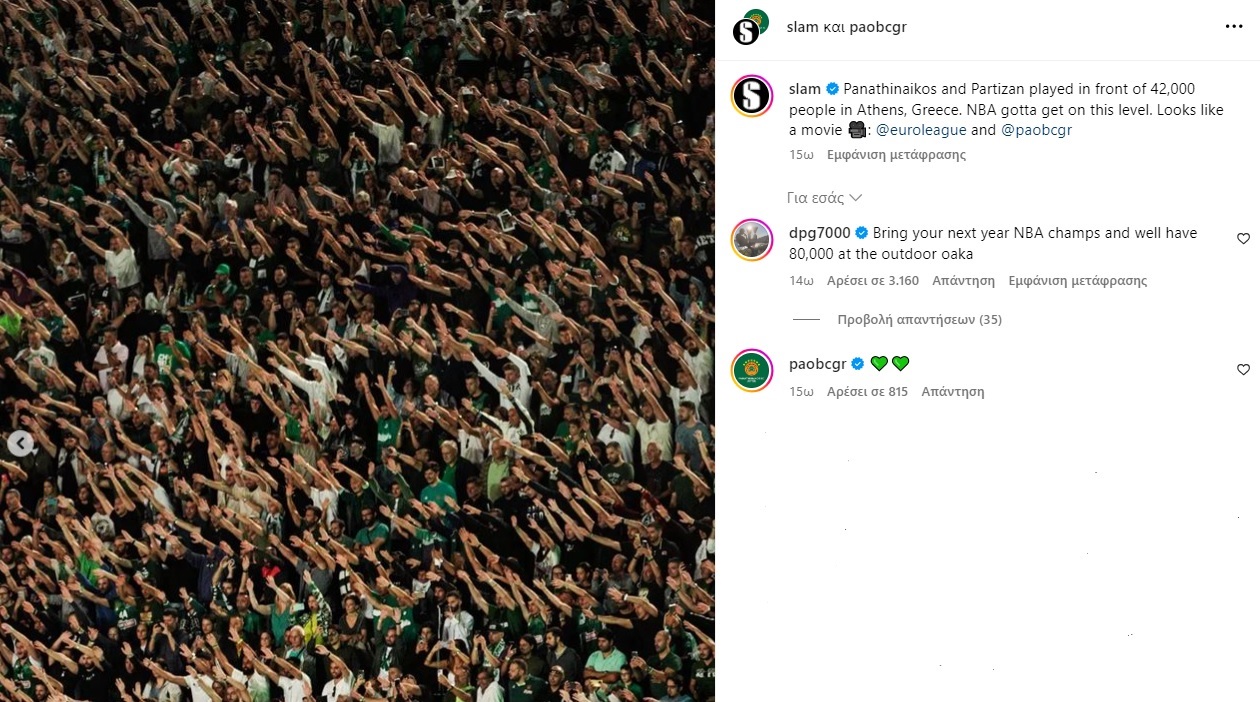 Οι εικόνες από τους 42.000 θεατές στη μαγική βραδιά του Σαββάτου στο «Καλλιμάρμαρο» για το «Παύλος Γιαννακόπουλος» έκαναν τον γύρο του κόσμου. Το δημοφιλής σελίδα Slam έκανε ειδική μνεία αναφέροντας πως «... Παναθηναϊκός και Παρτίζαν έπαιξαν μπροστά σε 42.000 θεατές στην Αθήνα. Το ΝΒΑ πρέπει να ανέβει σε αυτό το επίπεδο. Μοιάζει με ταινία!».