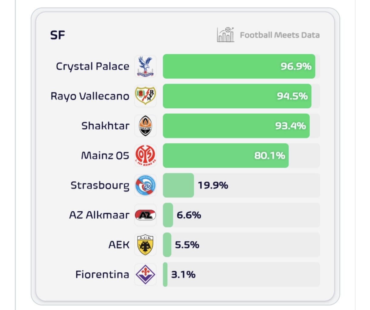 Επιπλέον, η ομάδα του Μάρκο Νίκολιτς μετά το χθεσινό αποτέλεσμα έχει πιθανότητες 2,1% για να βρεθεί στον τελικό και 0,8%, για να κατακτήσει το τρόπαιο στον τελικό της Λειψίας. Πρώτο φαβορί για τον τίτλο δίνεται η Κρίσταλ Πάλας με 48,1%, ακολουθεί η Μάιντς με 21%, ενώ τρίτη είναι η Ράγιο Βαγεκάνο με 16,9%. Λιγότερες πιθανότητες από την ΑΕΚ έχει μόνο η Άλκμααρ (0,4%).
