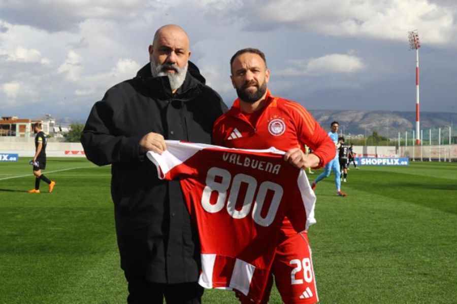 Συγκεκριμένα, πριν από την έναρξη του αγώνα στο προπονητικό κέντρο του Ρέντη, ο Αντιπρόεδρος της ΠΑΕ Ολυμπιακός, Κώστας Καραπαπάς, έδωσε στον Βαλμπουενά μια φανέλα που είχε το όνομά του και το νούμερο 800 στο πίσω μέρος της, με τον Γάλλο να αποθεώνεται από τον κόσμο που βρίσκεται στις κερκίδες!_151058.jpg)