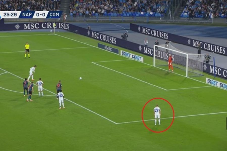 Interessante schema di #Fabregas sul calcio di rigore assegnato in #NapoliComo: posiziona un giocatore sul lato corto dell’area di rigore per sfruttare una eventuale ribattuta laterale del portiere.