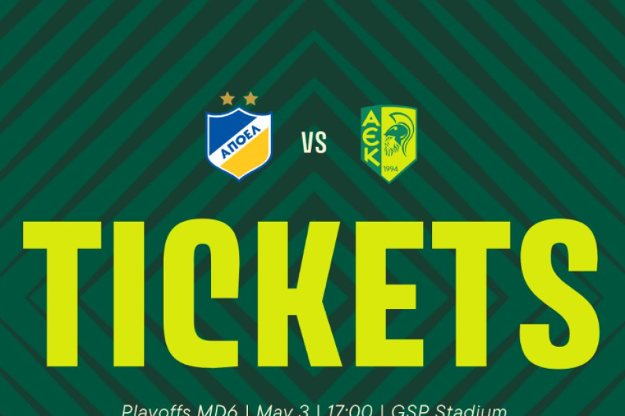 "Η ΑΕΚ LARNACA FC LTD ενημερώνει το φίλαθλο κοινό για τις λεπτομέρειες της προπώλησης εισιτηρίων του αγώνα της 6ης αγωνιστικής της Β' Φάσης του πρωταθλήματος με αντίπαλο το ΑΠΟΕΛ, ο οποίος θα διεξαχθεί την Κυριακή (03/05) στις 17:00 στο ΓΣΠ.