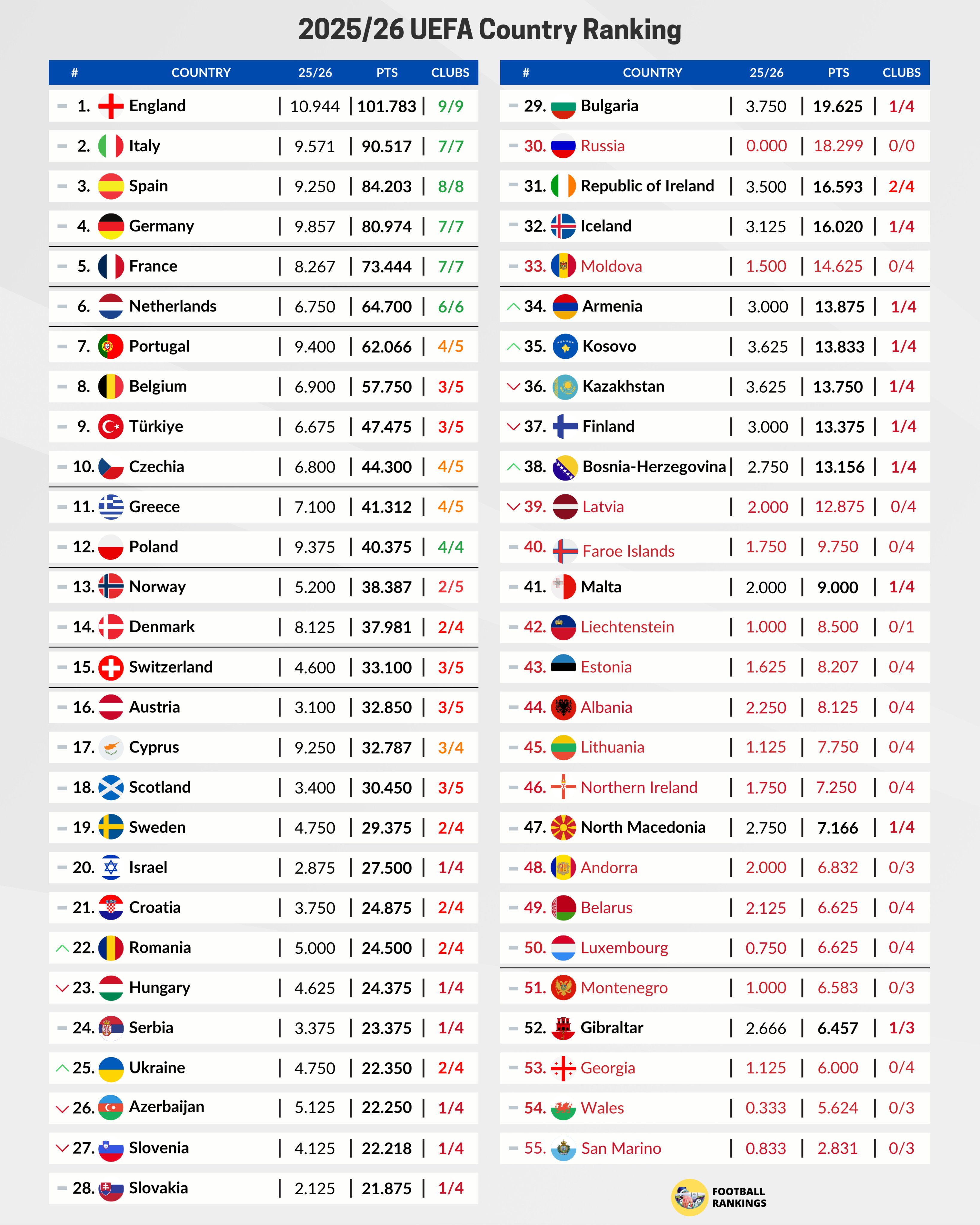 Όσο αφορά την κατάταξη της UEFA, η Κύπρος είναι αυτή τη στιγμή στη 17η θέση με 32.787 βαθμούς, βρισκόμενη σε απόσταση αναπνοής πίσω από την Αυστρία (32.850) και την Ελβετία (33.100).