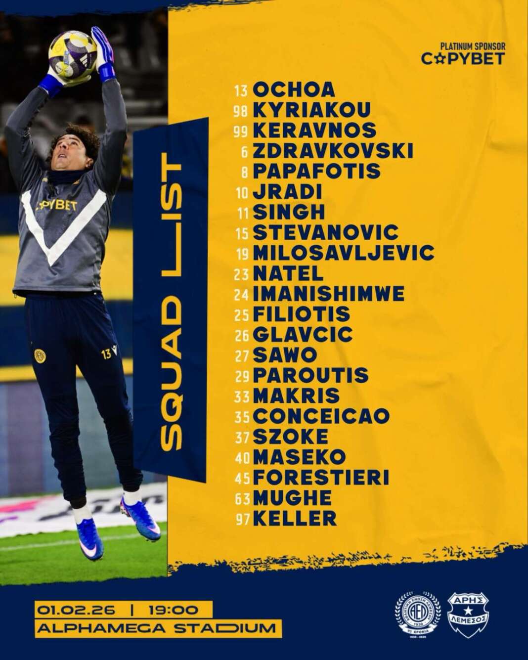 Η ΑΕΛ ανακοίνωσε την αποστολή ενόψει του αυριανού ντέρμπι με τον Άρη, στο πλαίσιο της 20ης αγωνιστικής.