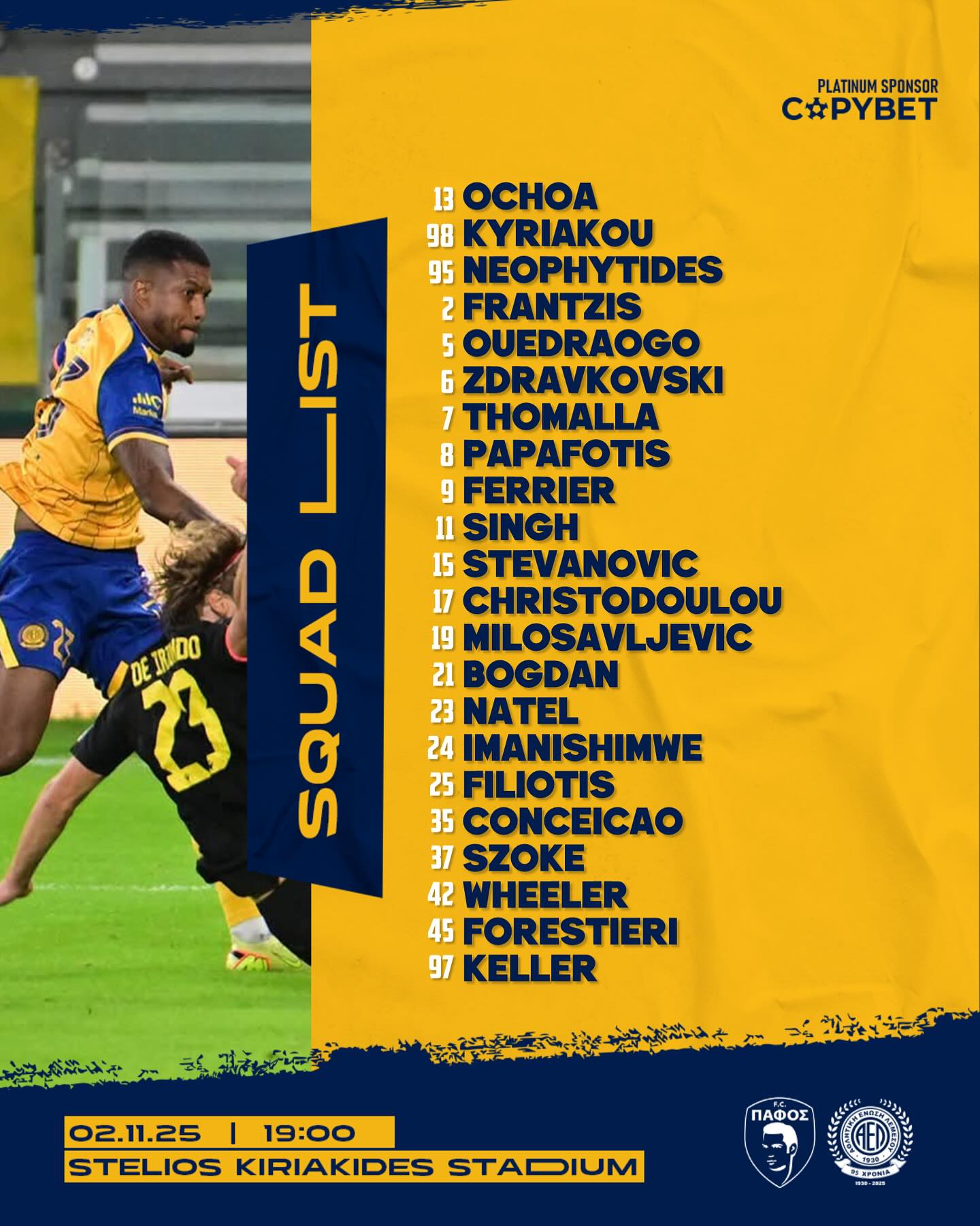 Την αποστολή για το αυριανό (01/11) εκτός έδρας ματς με την Πάφο ανακοίνωσε η Πάφος. Εκτός έμειναν όπως αναμενόταν οι οι Γκλάβσιτς, Ζράντι, Παναγή, Κεραυνός και Νεοφύτου, ενώ απροόπτο προέκυψε με Μακρή, ο οποίος επίσης δεν βρίσκεται στην αποστολή.