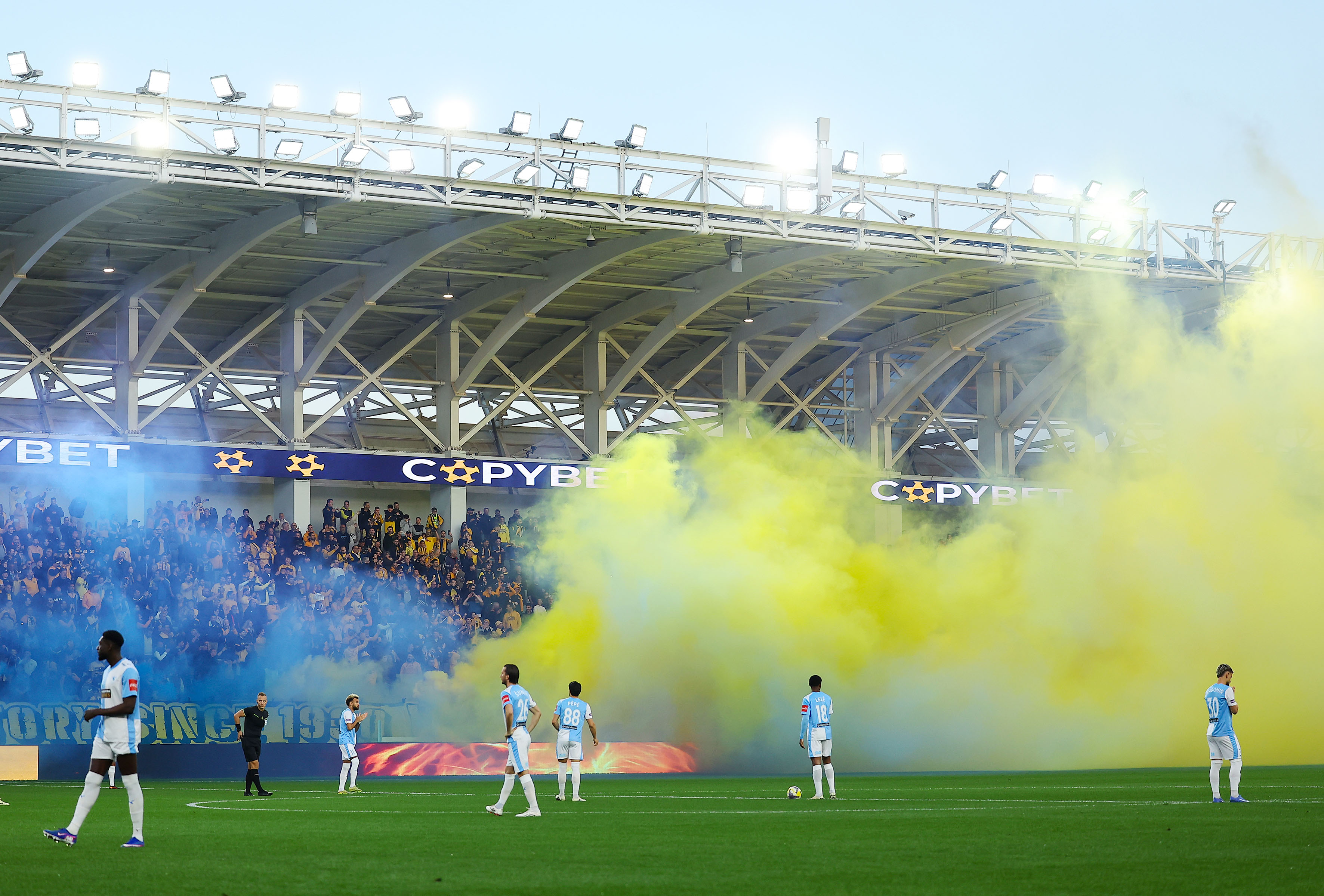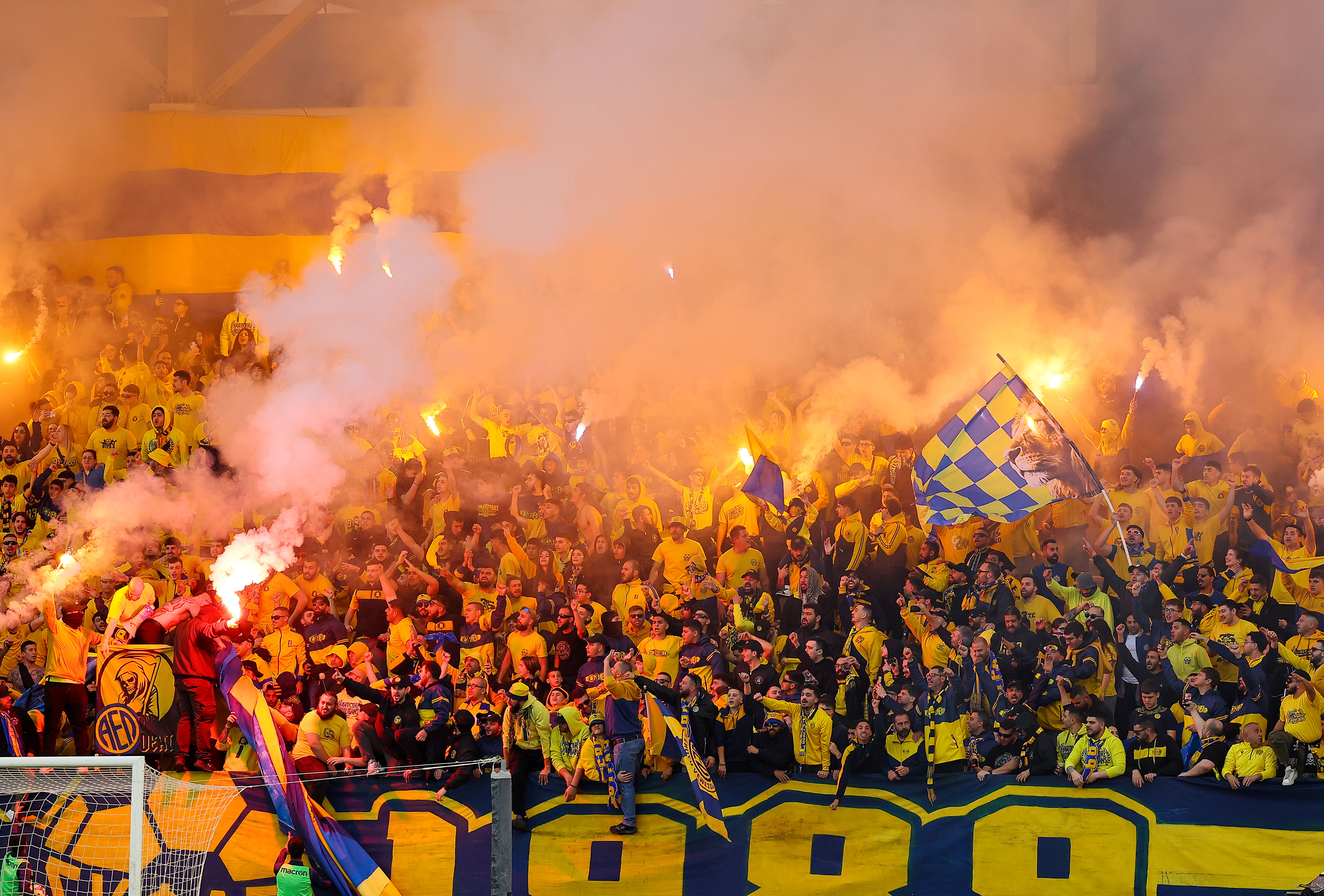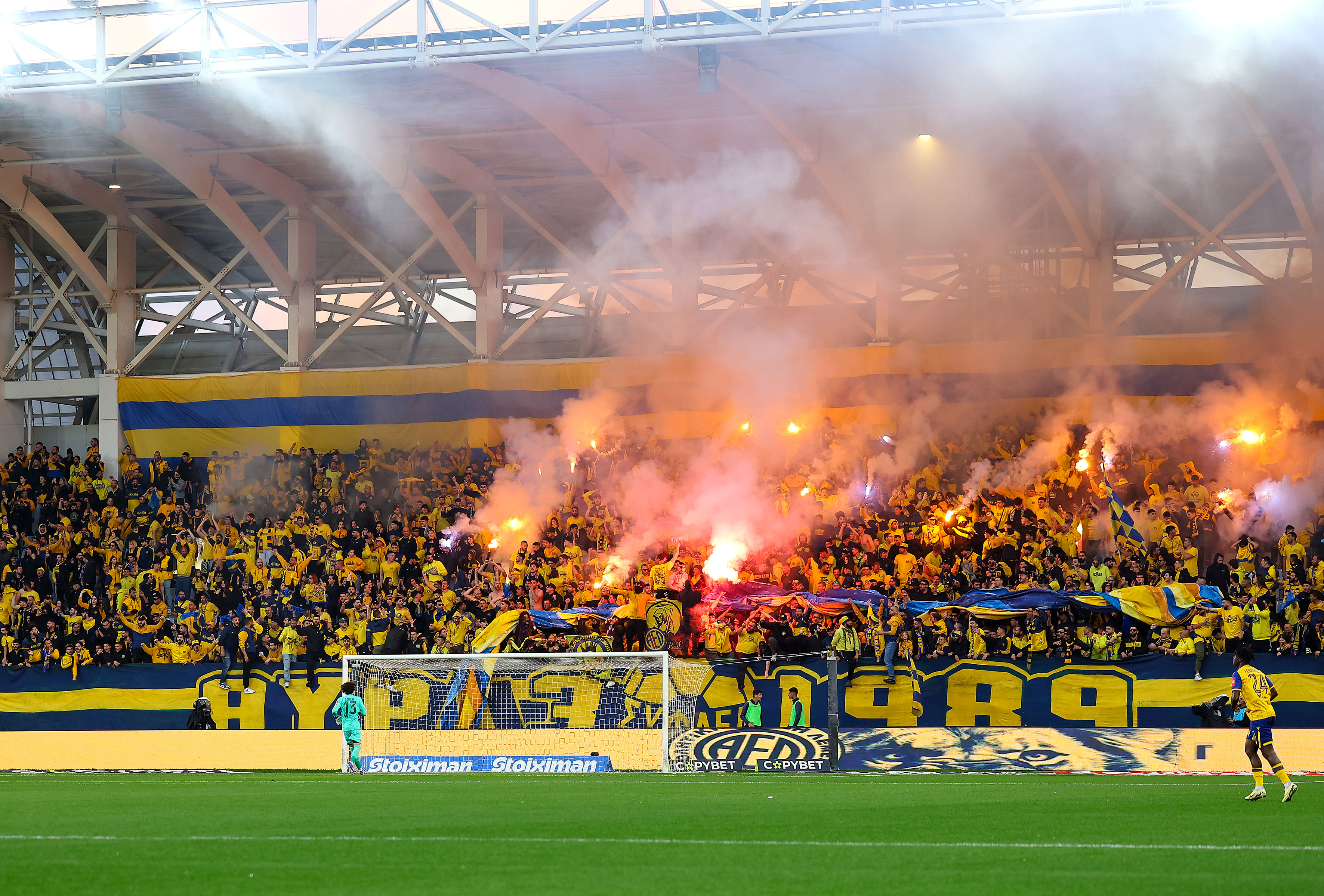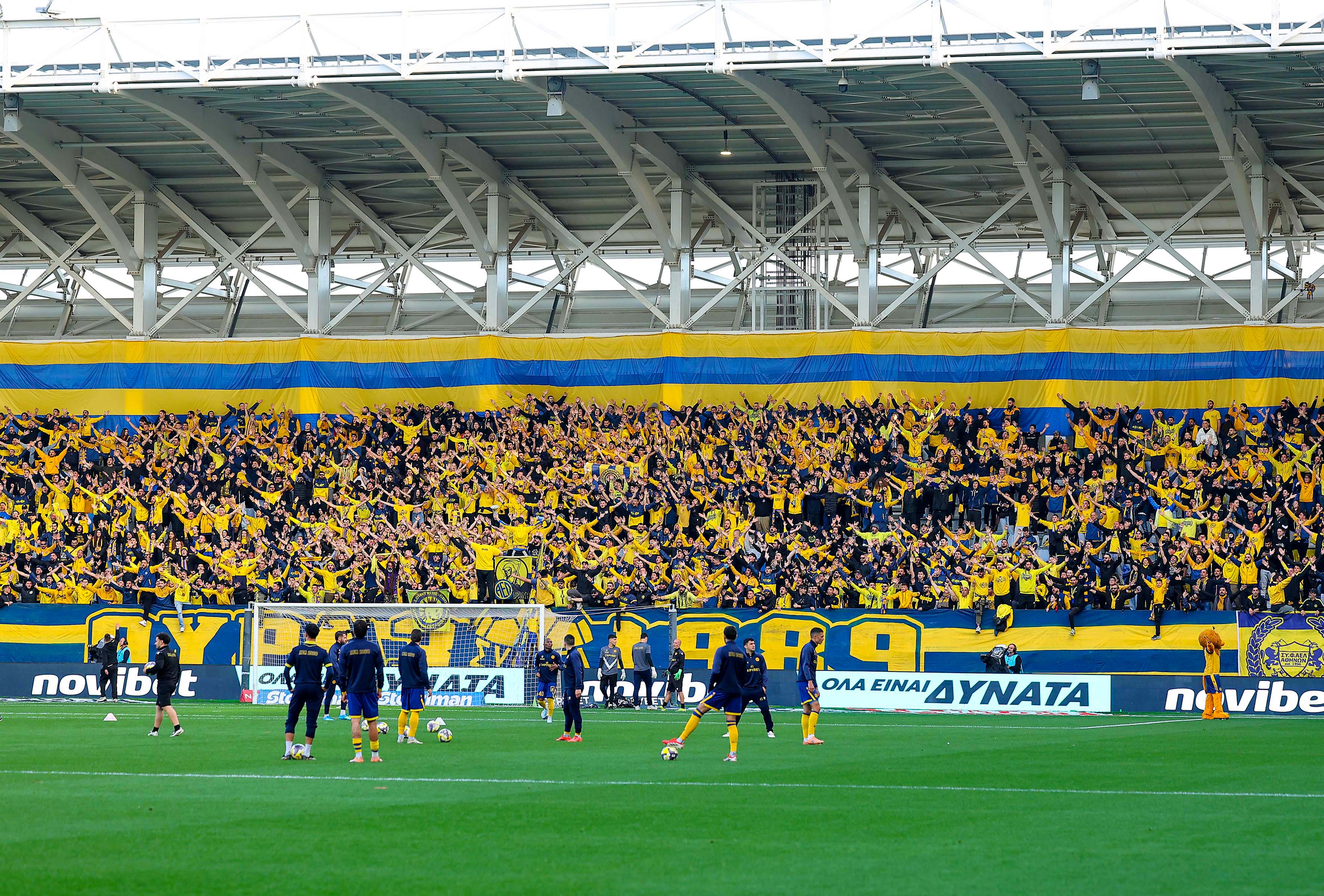 Οι φίλοι της ΑΕΛ ετοίμασαν καυτή υποδοχή στους ποδοσφαιριστές της ομάδας τους με την είσοδο τους στον αγωνιστικό χώρο του «Αλφαμέγα».
