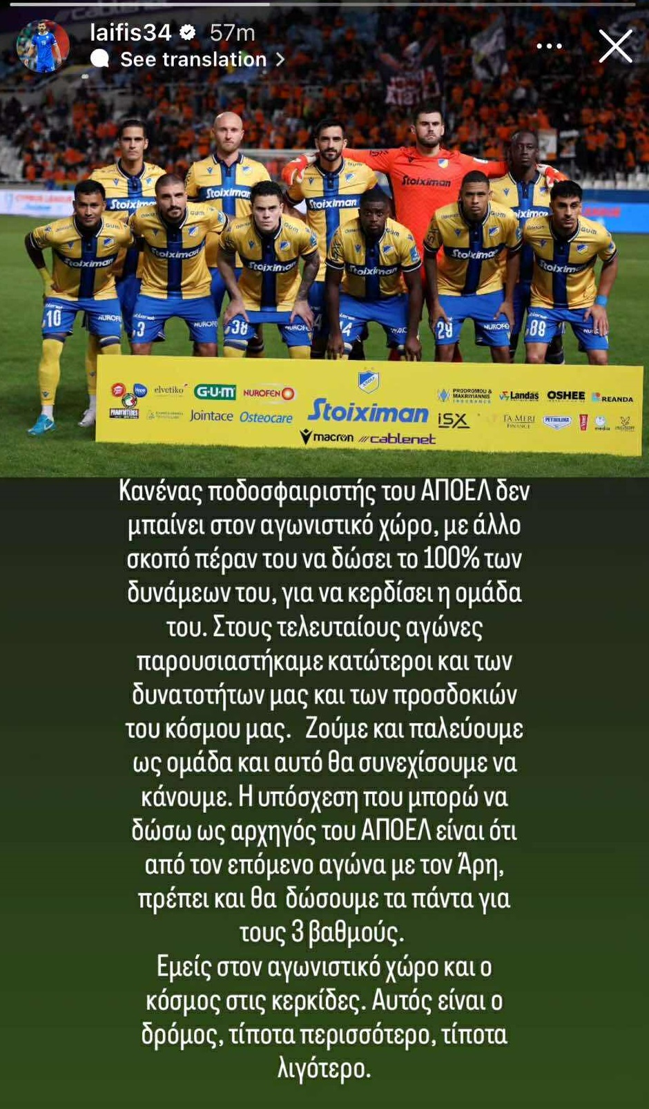 Μήνυμα αντεπίθεσης στέλνει ο αρχηγός του ΑΠΟΕΛ Κωνσταντίνος Λαΐφης, με ανάρτηση στα μέσα κοινωνικής δικτύωσης.