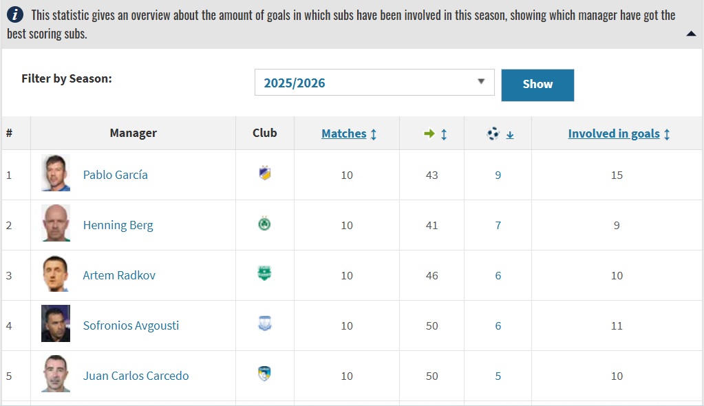 Στη 2η θέση της σχετικής κατηγορίας βρίσκεται ο Χένινγκ Μπεργκ, με την Ομόνοια να έχει πάρει εφτά γκολ από παίκτες που ήρθαν από τον πάγκο, με τις αλλαγές να έχουν γενική συνεισφορά (με γκολ ή ασίστ) σε εννιά τέρματα. Την τετράδα συμπληρώνουν Σωφρόνης Αυγουστή και Αρτσιόμ Ρατσκόφ.