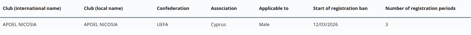 Νέο θέμα προέκυψε για το ΑΠΟΕΛ, καθώς του επιβλήθηκε μεταγραφικό εμπάργκο από τη FIFA, σύμφωνα με ανάρτηση στην επίσημη ιστοσελίδα της.