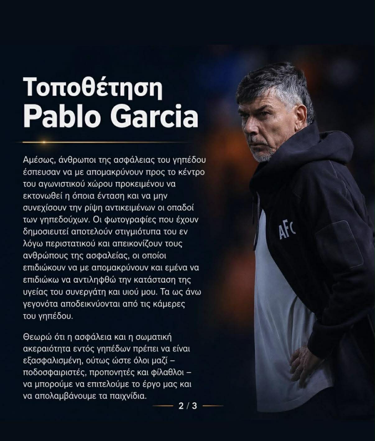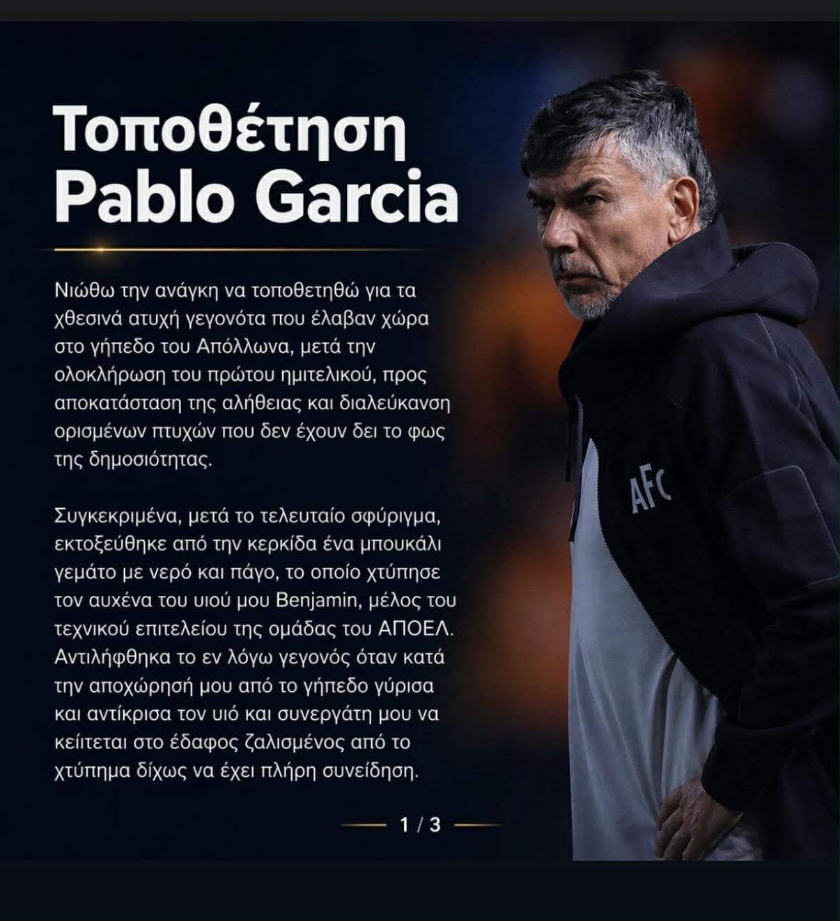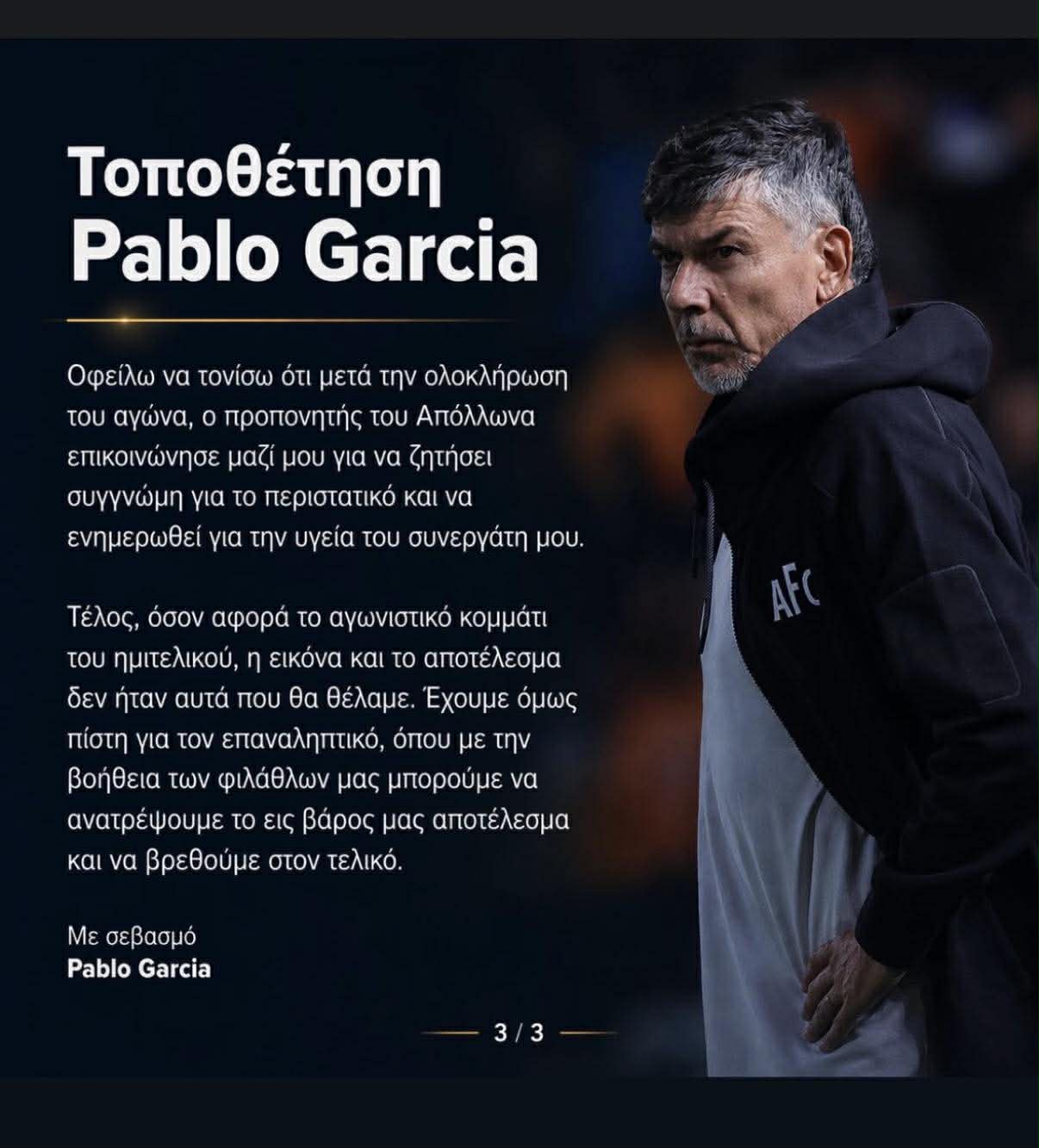 Ο Πάμπλο Γκαρσία επέλεξε να τοποθετηθεί δημόσια μέσα από τα κοινωνικά δίκτυα, παρουσιάζοντας τη δική του εκδοχή για όσα συνέβησαν μετά το τέλος του ημιτελικού στο «Αλφαμέγα», όπου η ομάδα του ηττήθηκε με 2-4 από τον Απόλλωνα.