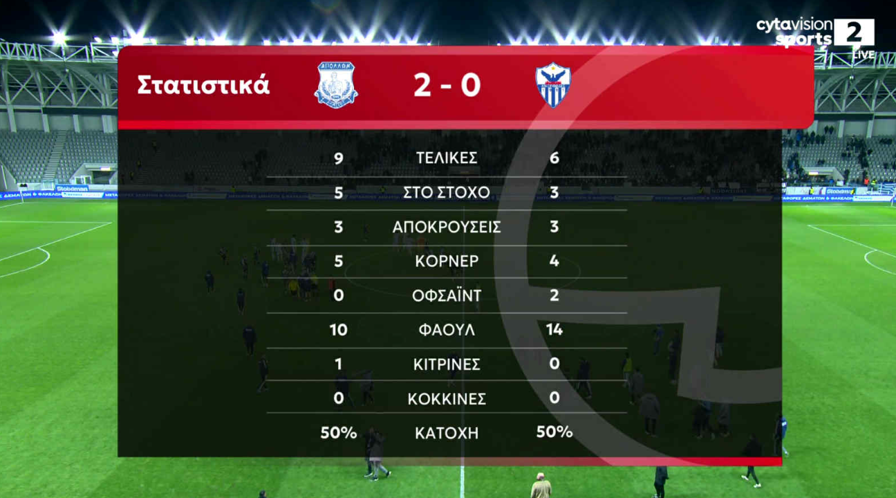 Δυο λεπτά αργότερα ο Απόλλωνας άνοιξε το σκορ! Μετά από κάθετη πάσα ο Μάρκες διανύσετε κάποια μέτρα με την μπάλα, βρέθηκε σε θέση τετ-α- τετ και κέρδισε τον Κάρλστρομ. Ο βοηθός σήκωσε την σημαία στο βάθος, όμως μετά από παρέμβαση του VAR το γκολ μέτρησε κανονικά.