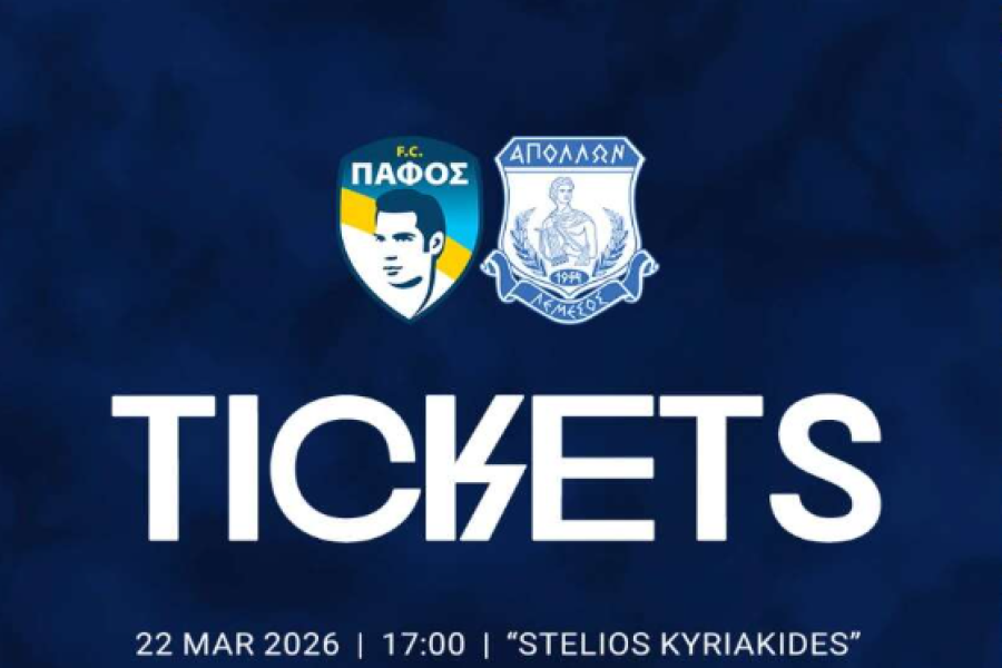 Η Εταιρεία Απόλλων Ποδόσφαιρο (Δημόσια) Λτδ, ανακοινώνει ότι το απόγευμα της Τρίτης (17/03, 15:00) αρχίζει η προπώληση εισιτηρίων για τον αγώνα με αντίπαλο την Πάφο, ο οποίος θα διεξαχθεί την Κυριακή (22/03, 17:00) στο “Στέλιος Κυριακίδης”.