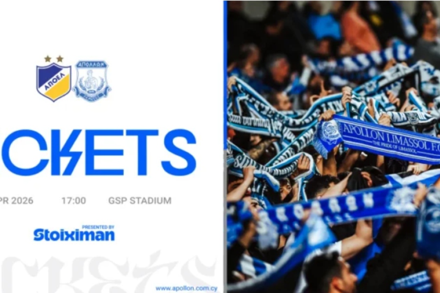 Η Εταιρεία Απόλλων Ποδόσφαιρο (Δημόσια) Λτδ, ανακοινώνει ότι το απόγευμα της Μεγάλης Τρίτης (7/04, 15:00) αρχίζει η προπώληση εισιτηρίων, για τον αγώνα της 3ης αγωνιστικής της Β’ φάσης του Cyprus League by Stoiximan με αντίπαλο τον ΑΠΟΕΛ, ο οποίος θα διεξαχθεί την Τρίτη του Πάσχα (14/04, 17:00) στο ΓΣΠ.