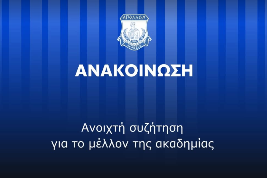 Απευθύνουμε ανοιχτή πρόσκληση σε κάθε αγνό Απολλωνίστα ο οποίος επιθυμεί να μας μεταφέρει τις απόψεις και τις εισηγήσεις του για την ανάπτυξη της Ακαδημίας μας, να δηλώσει συμμετοχή στον Διευθυντή της Ακαδημίας μας, κ.Σπύρο Χριστοφόρου στο τηλέφωνο 99011460 μέχρι την Τέταρτη (04/02,18:00).