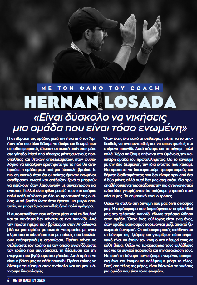 Ο προπονητής του Απόλλωνα, Ερνάν Λοσάδα, παραχώρησε συνέντευξη στο match programme της ομάδας, ενόψει του σημερινού (26.4, 19:00) αγώνα κόντρα στην Ομόνοια.