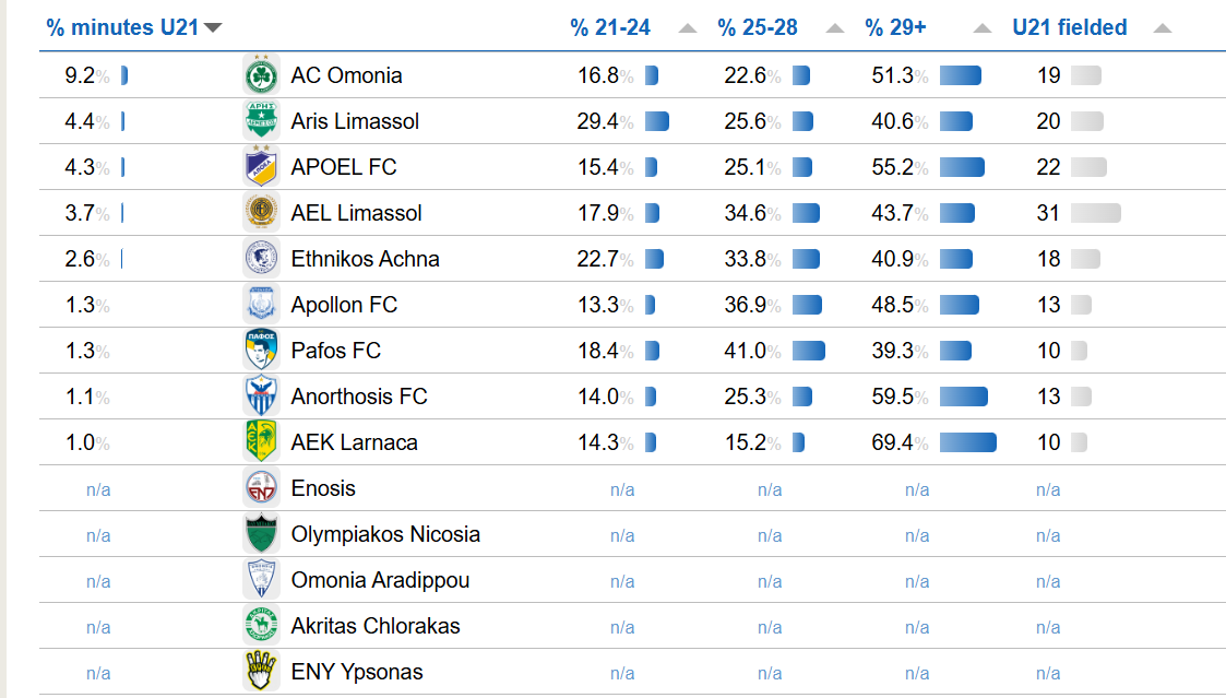Σε εγχώριο επίπεδο, η Ομόνοια καταγράφει το υψηλότερο ποσοστό αξιοποίησης παικτών U21, φτάνοντας το 9.2% των συνολικών αγωνιστικών λεπτών. Αν και η επίδοση αυτή την τοποθετεί στην κορυφή εντός Κύπρου, την ίδια στιγμή υπογραμμίζει και το χάσμα που τη χωρίζει από τα ευρωπαϊκά δεδομένα. Παρ’ όλα αυτά, οι «πράσινοι» αποτελούν διαχρονικά την ομάδα που επενδύει περισσότερο σε νεαρούς ποδοσφαιριστές, δίνοντας ευκαιρίες και αναδεικνύοντας ταλέντα από τις ακαδημίες, με οφέλη τόσο αγωνιστικά όσο και οικονομικά.